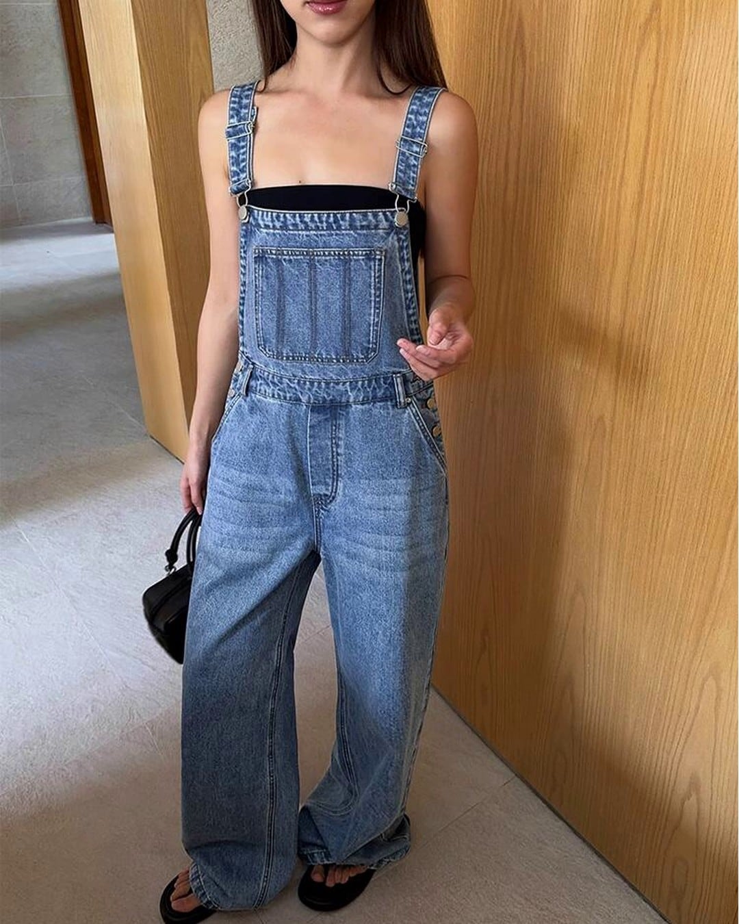 デニム素材のワイドレッグオーバーオールは、着心地の良さとシンプルなデザインが魅力です。ワイドレッグシルエットが、体型をカバーしながらもスタイリッシュな印象を与えてくれます。カジュアルな普段使いはもちろん、様々なシーンで活躍する、ワードローブに加えたい一着です。