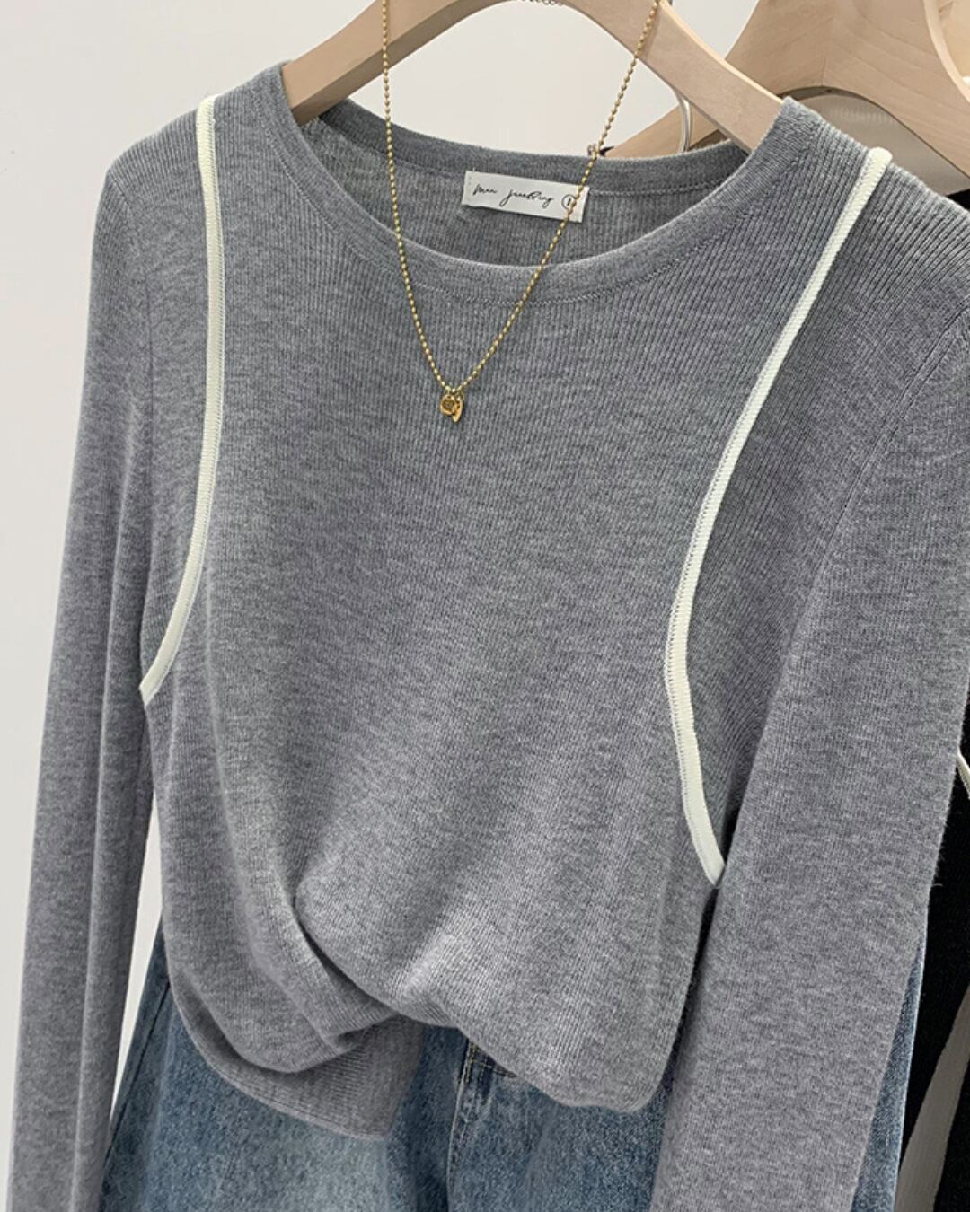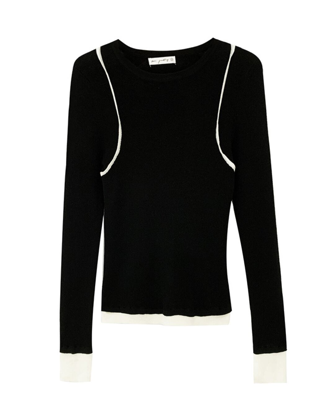 配色ラインがアクセントになったクルーネックニットトップスです。1枚でもインナーとしても活躍。