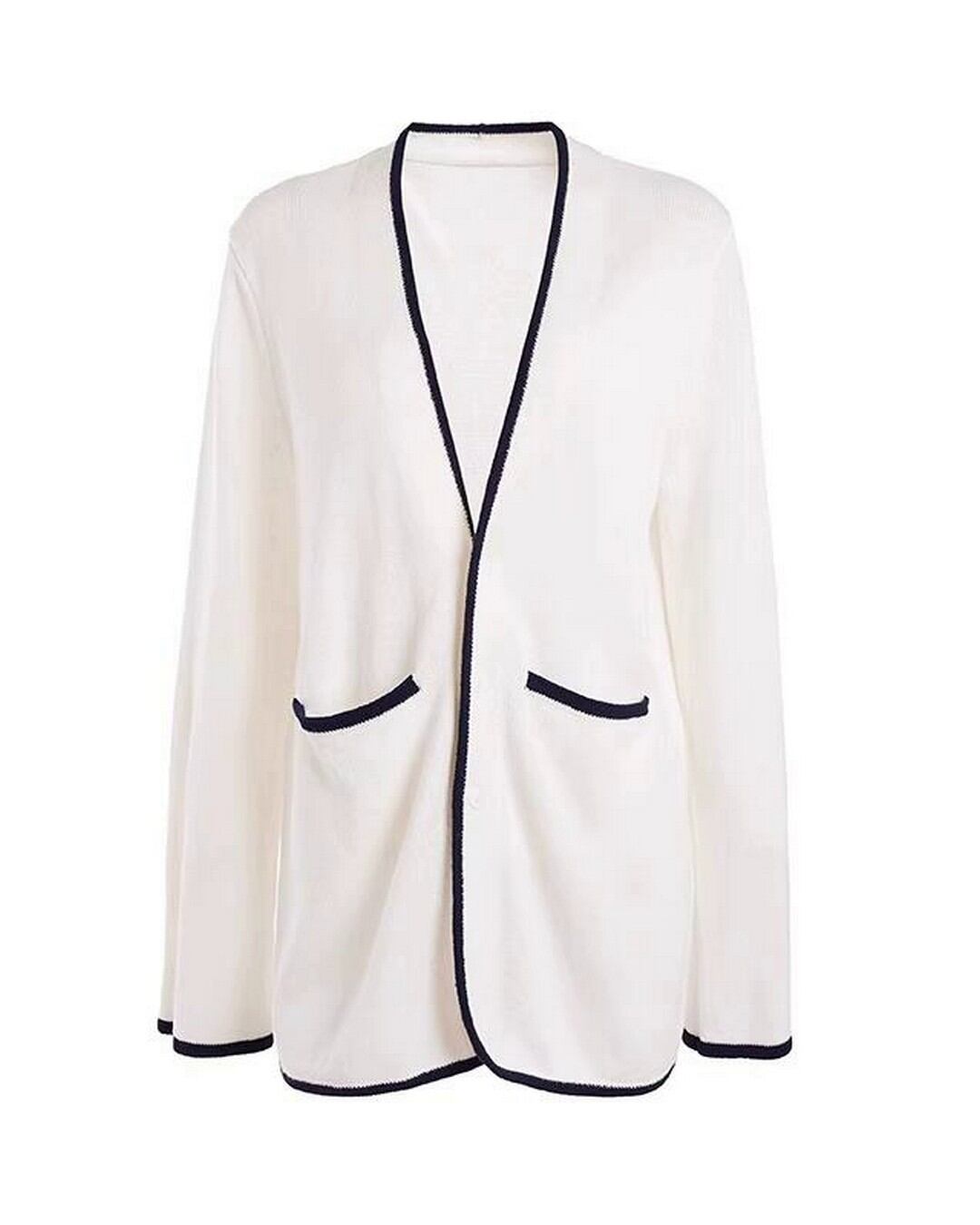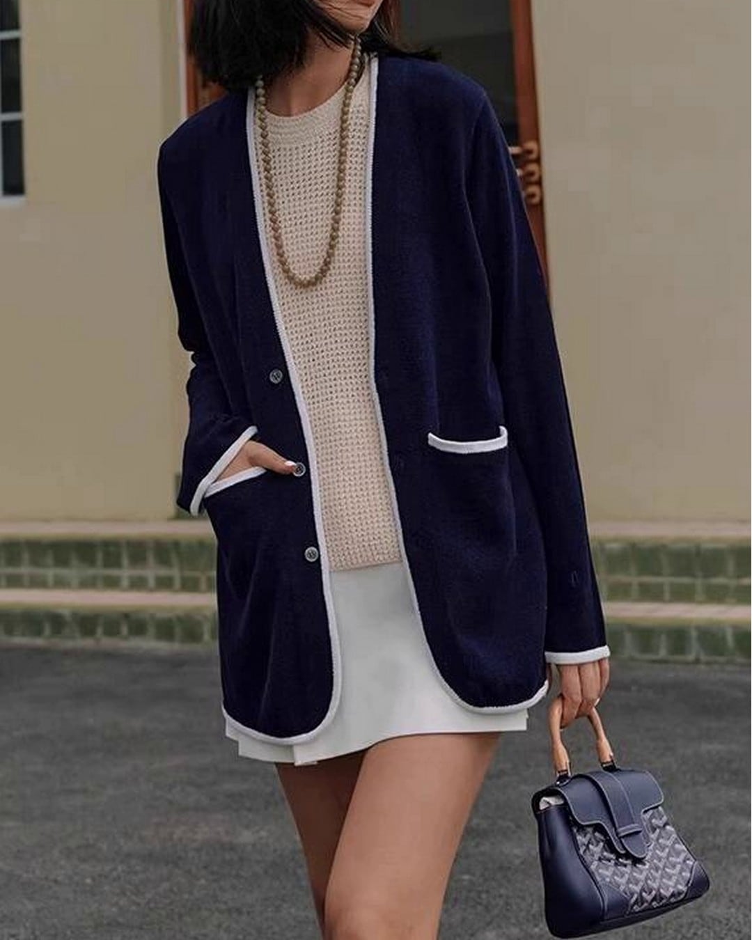 配色ラインが目を惹く、ジャケットライクなニットカーディガンです。