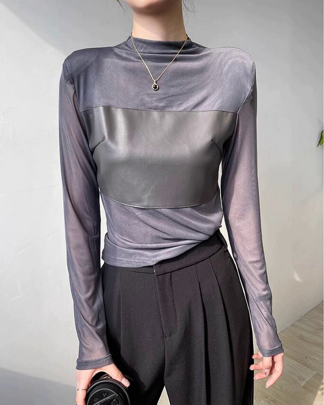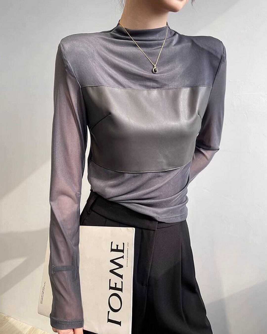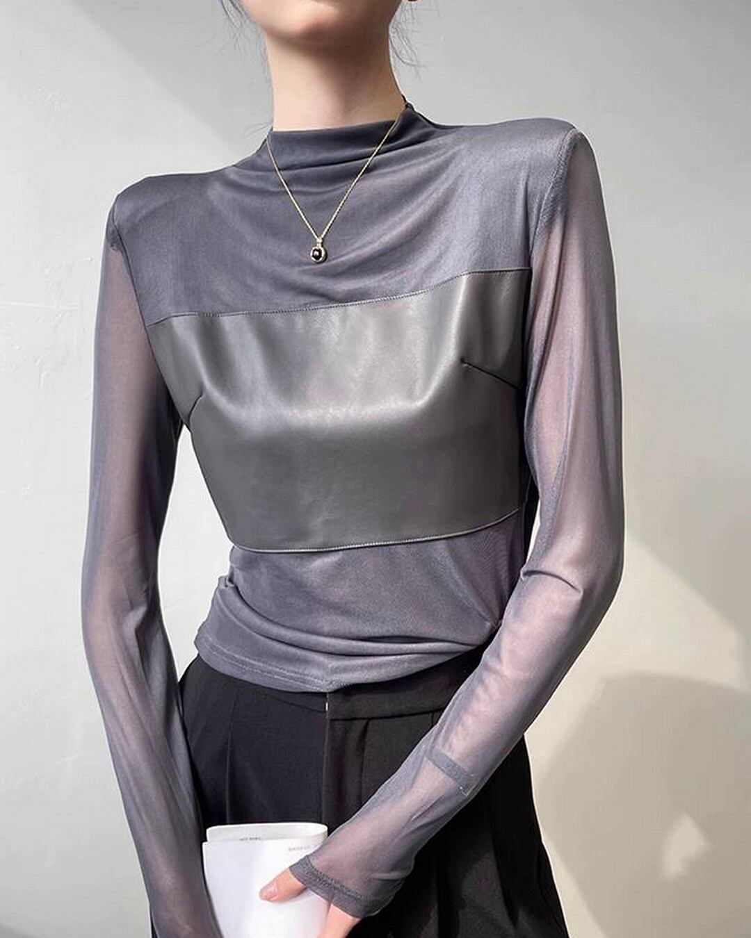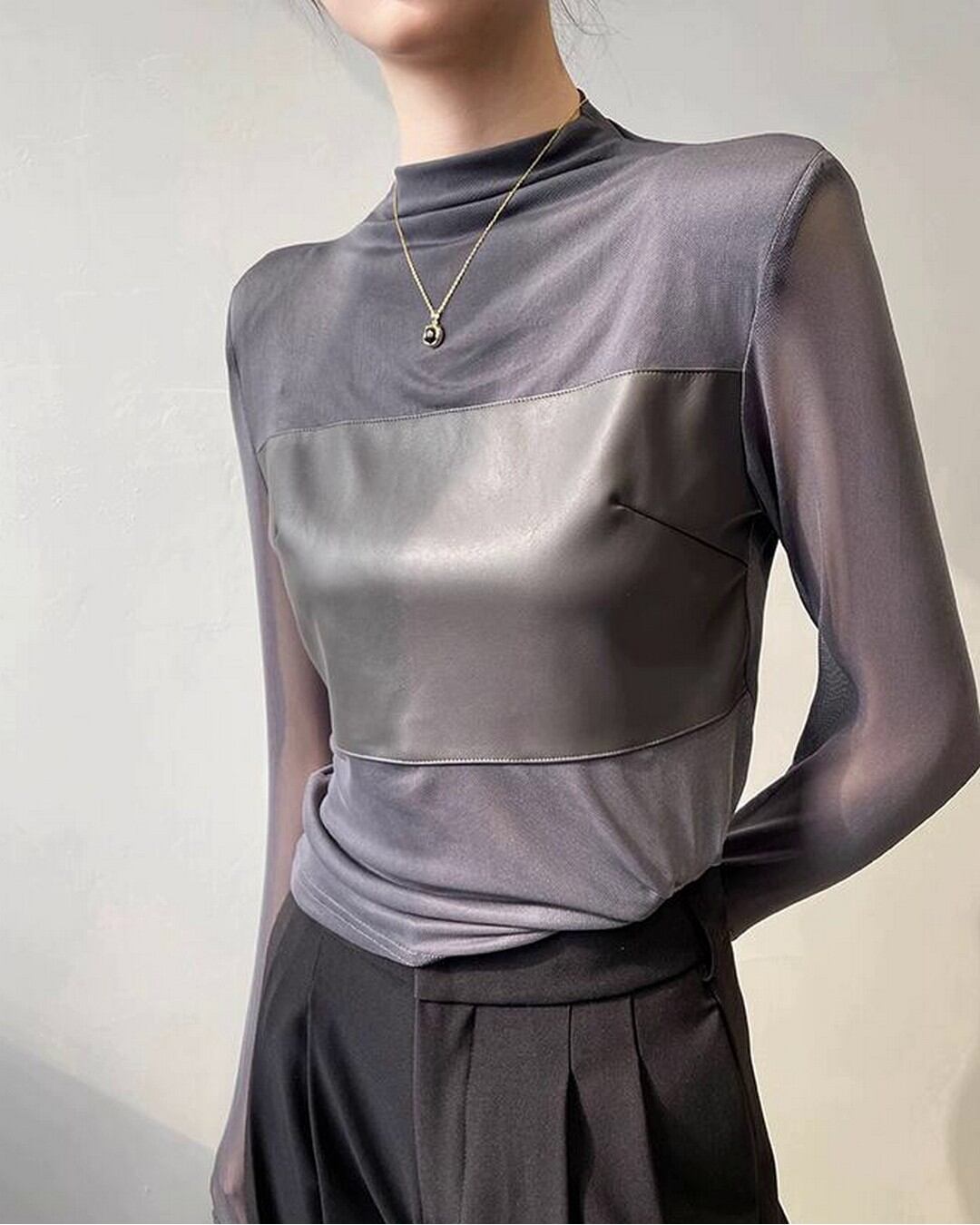 光沢のあるカラーブロックデザインが印象的なロングスリーブトップス。