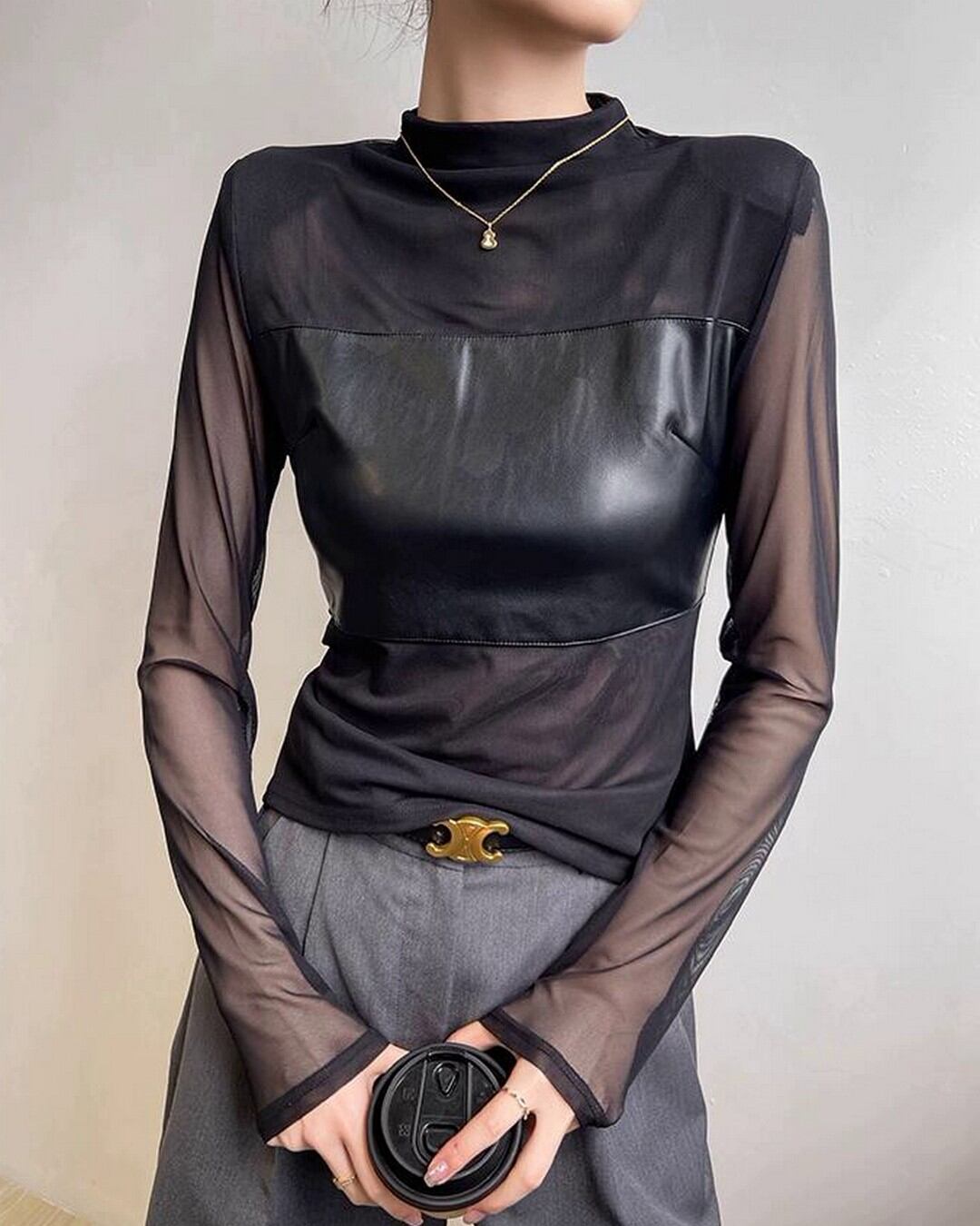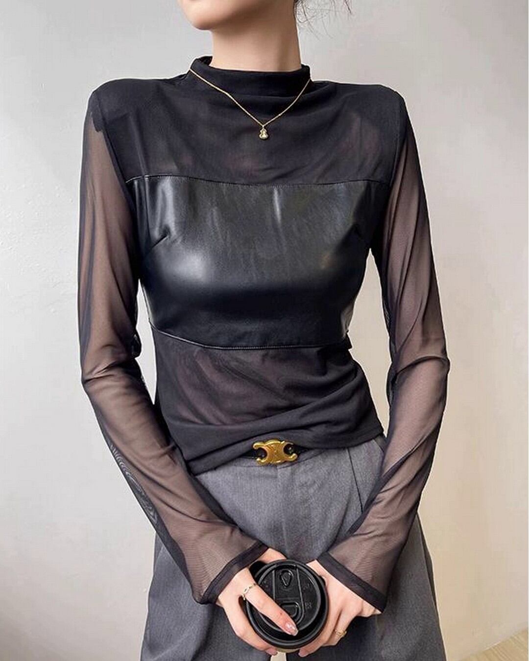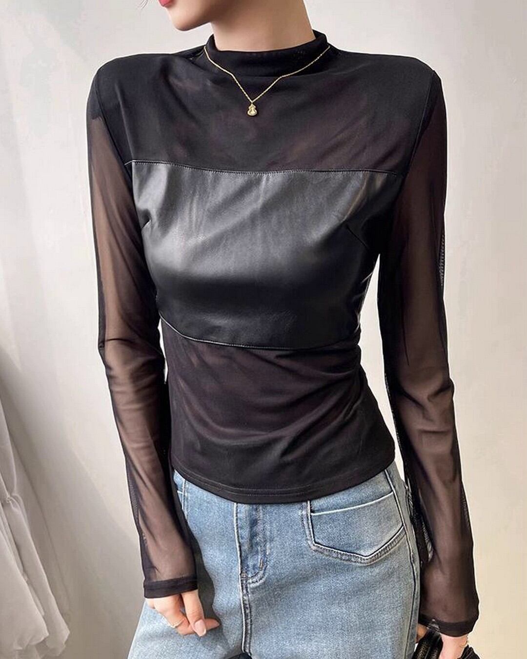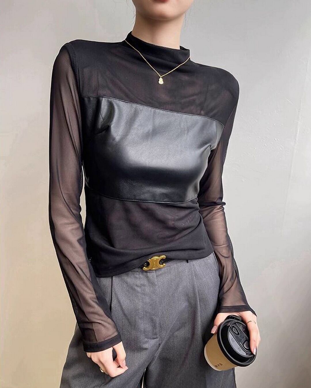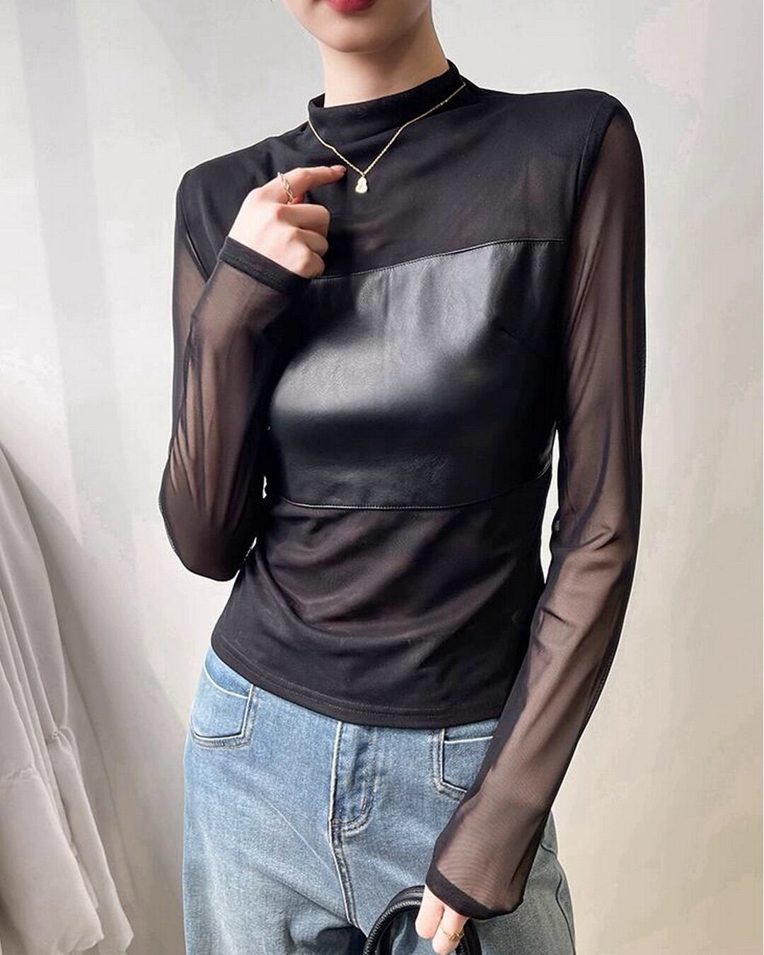光沢のあるカラーブロックデザインが印象的なロングスリーブトップス。