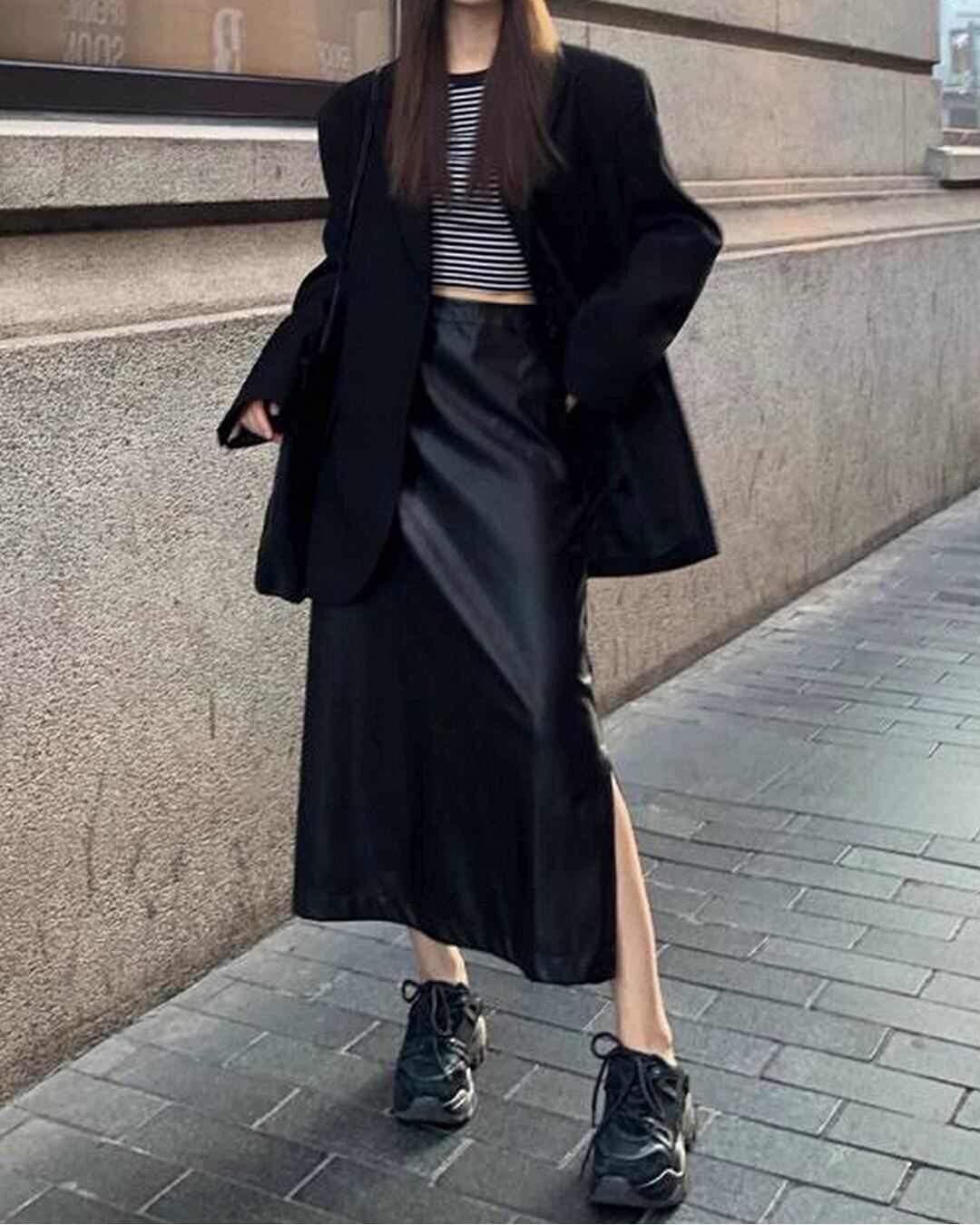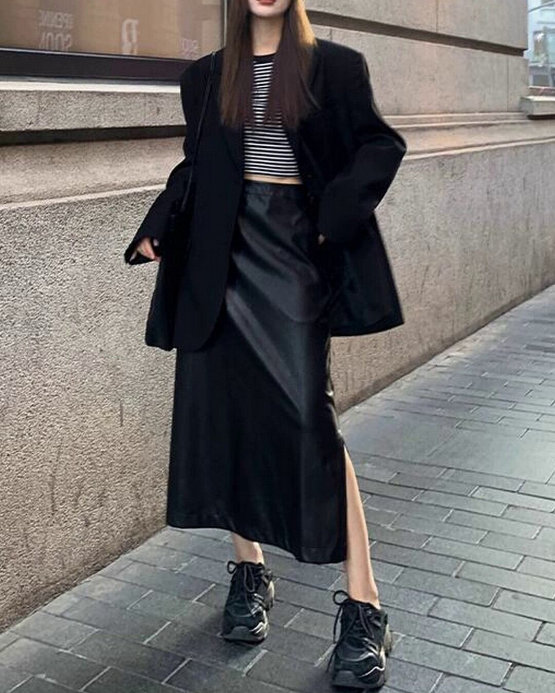 深めのスリットが歩くたびに動きを添え、抜け感のある女性らしさをプラス。
