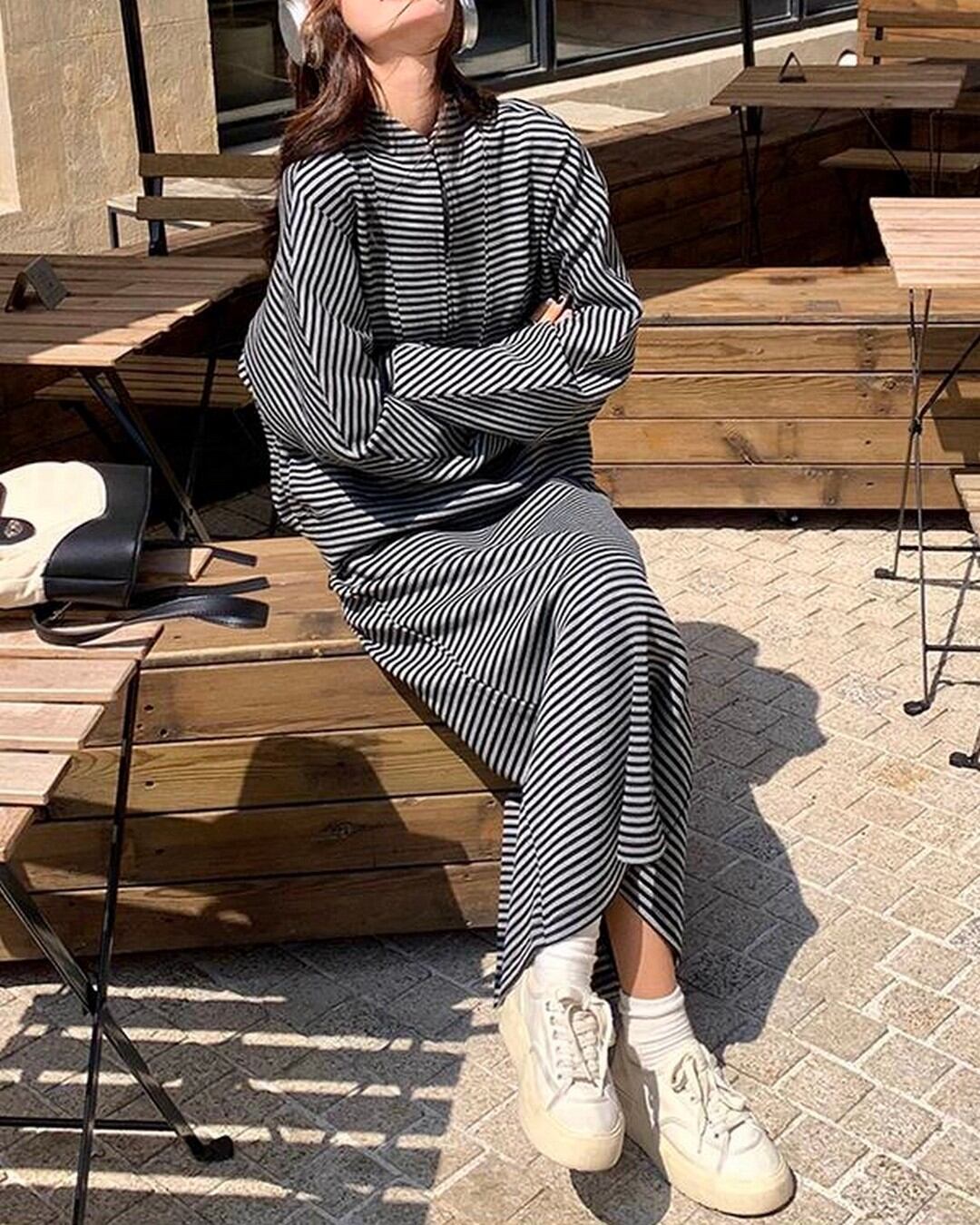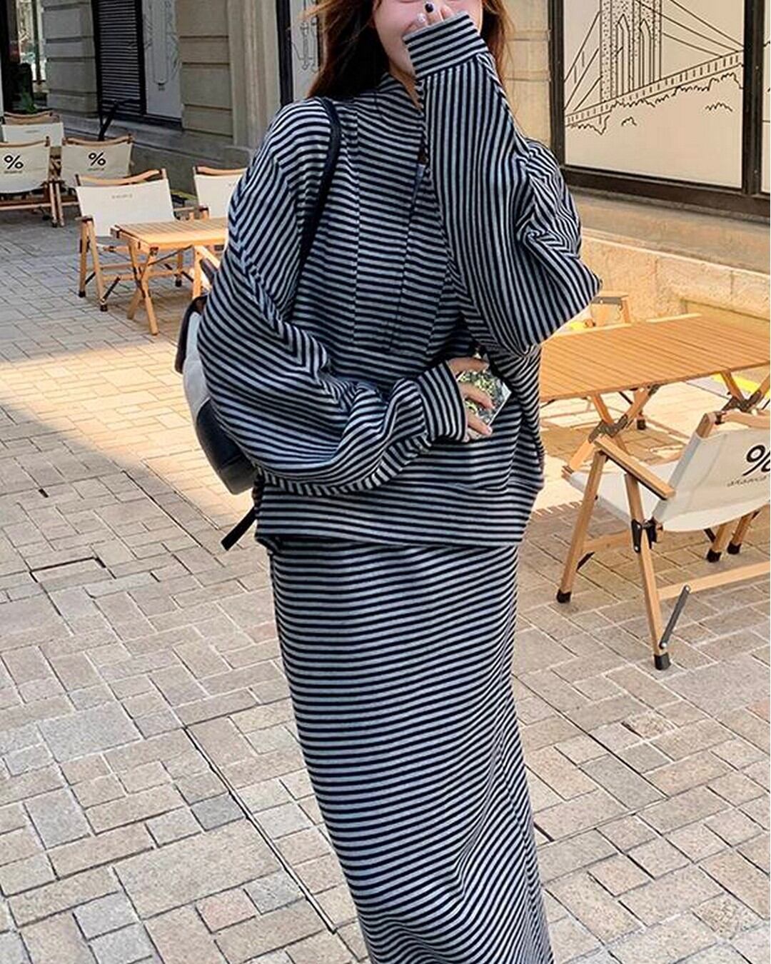 トップスはゆったりとしたシルエットで抜け感を演出し、ロングスカートは大人っぽく落ち着いた印象に。
