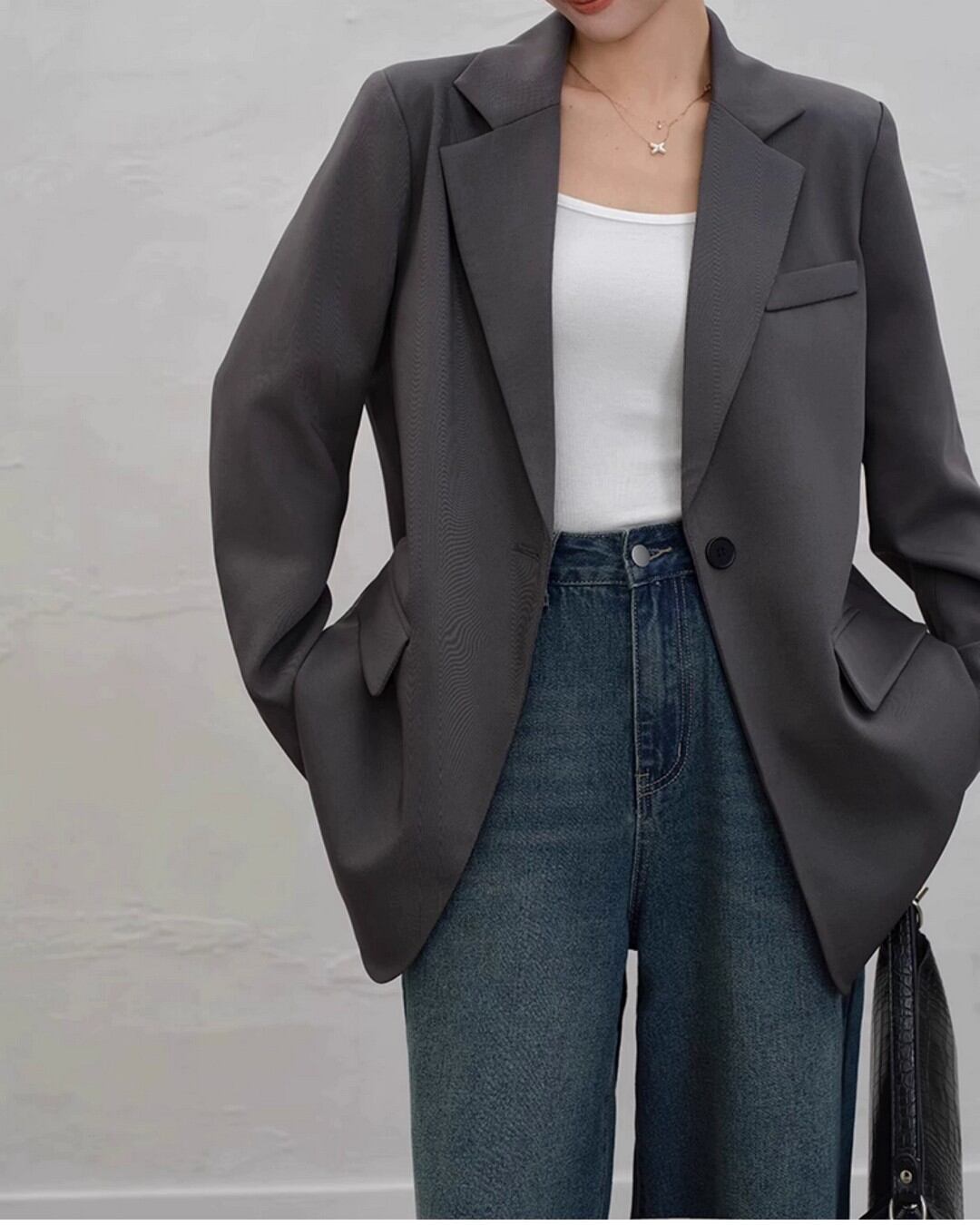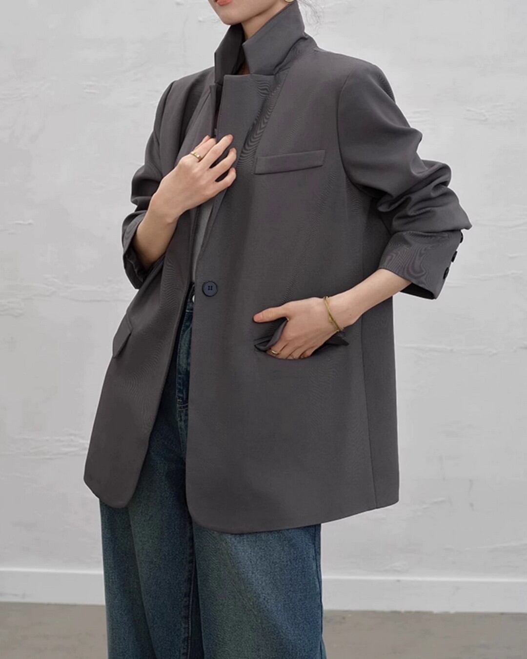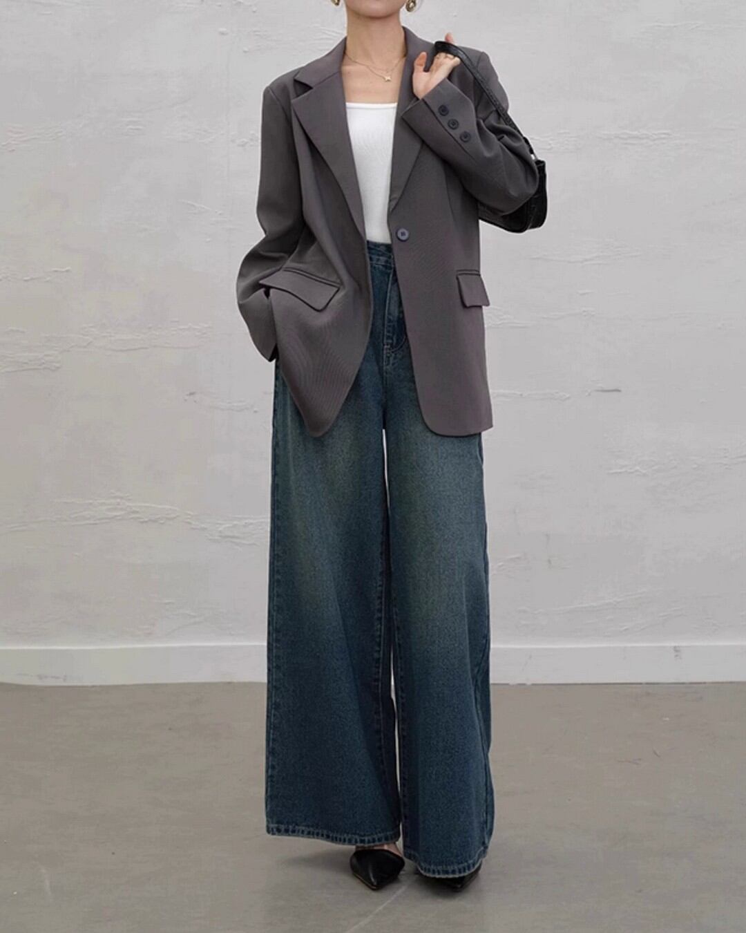 ゆったりとしたオーバーサイズシルエットが魅力のテーラードジャケット。