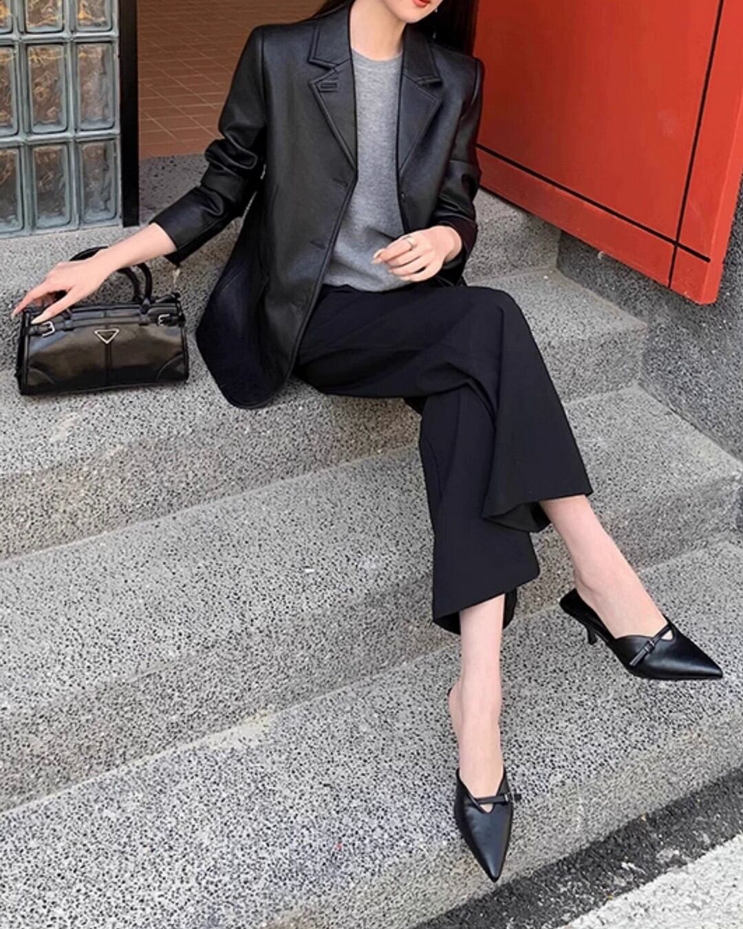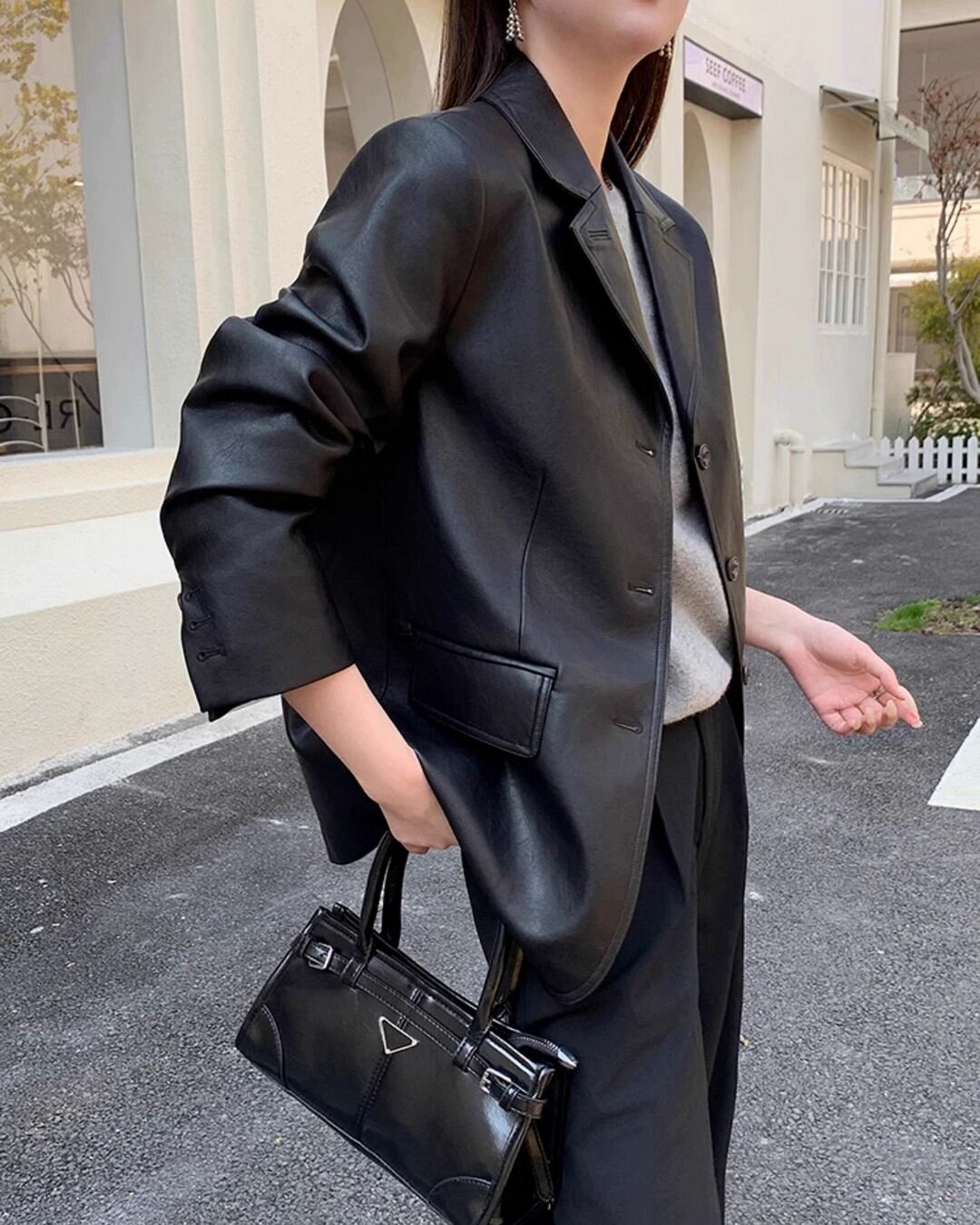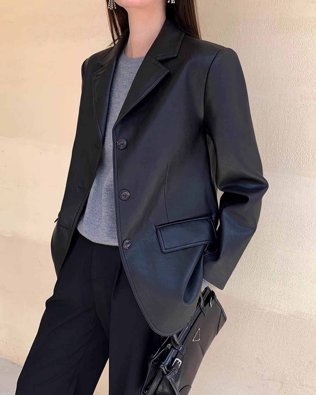 艶やかなフェイクレザーが存在感を放つスーツジャケット。