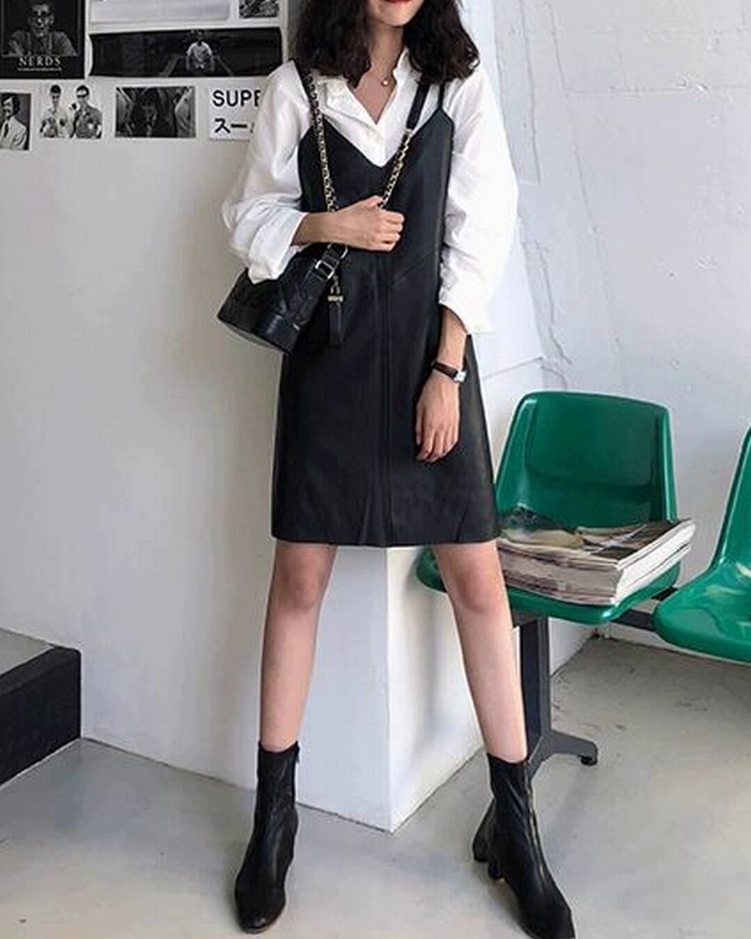 光沢感のあるPUレザーで仕立てたサスペンダードレス。