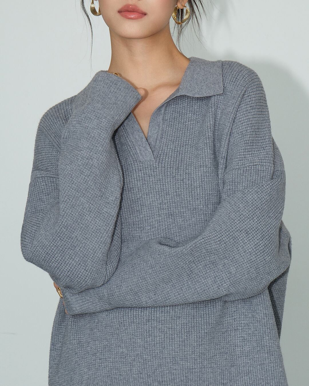 立体感のあるポロ襟デザインが顔まわりをすっきり見せてくれるニットプルオーバーです。