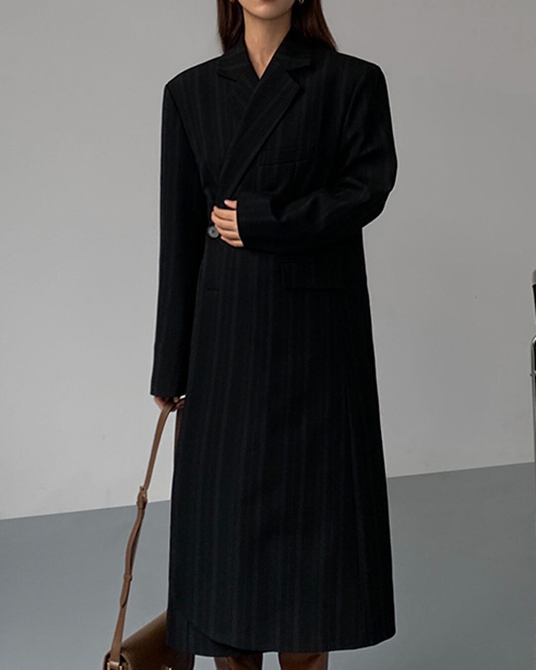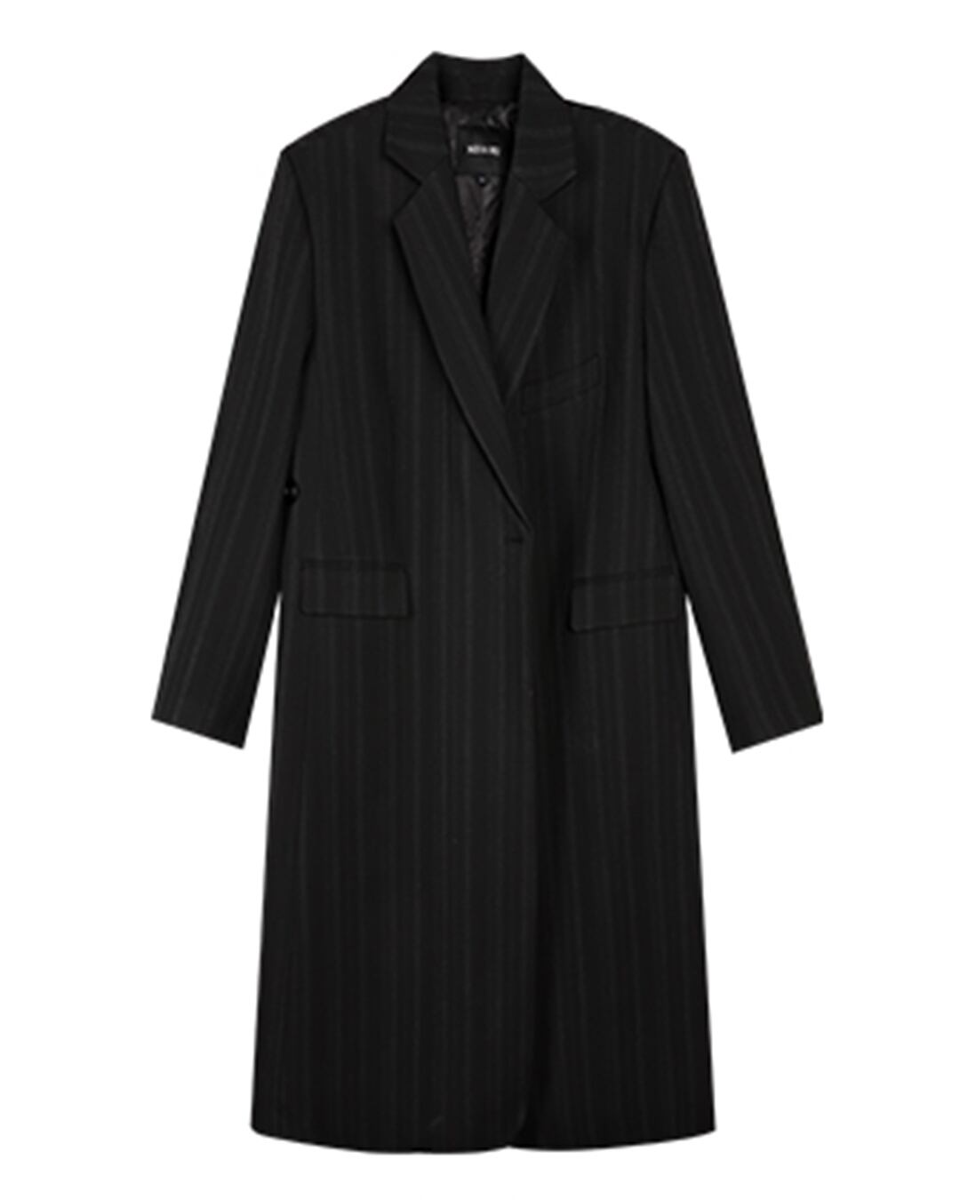 上品な雰囲気を纏うストライプ柄のロングテーラードコート。