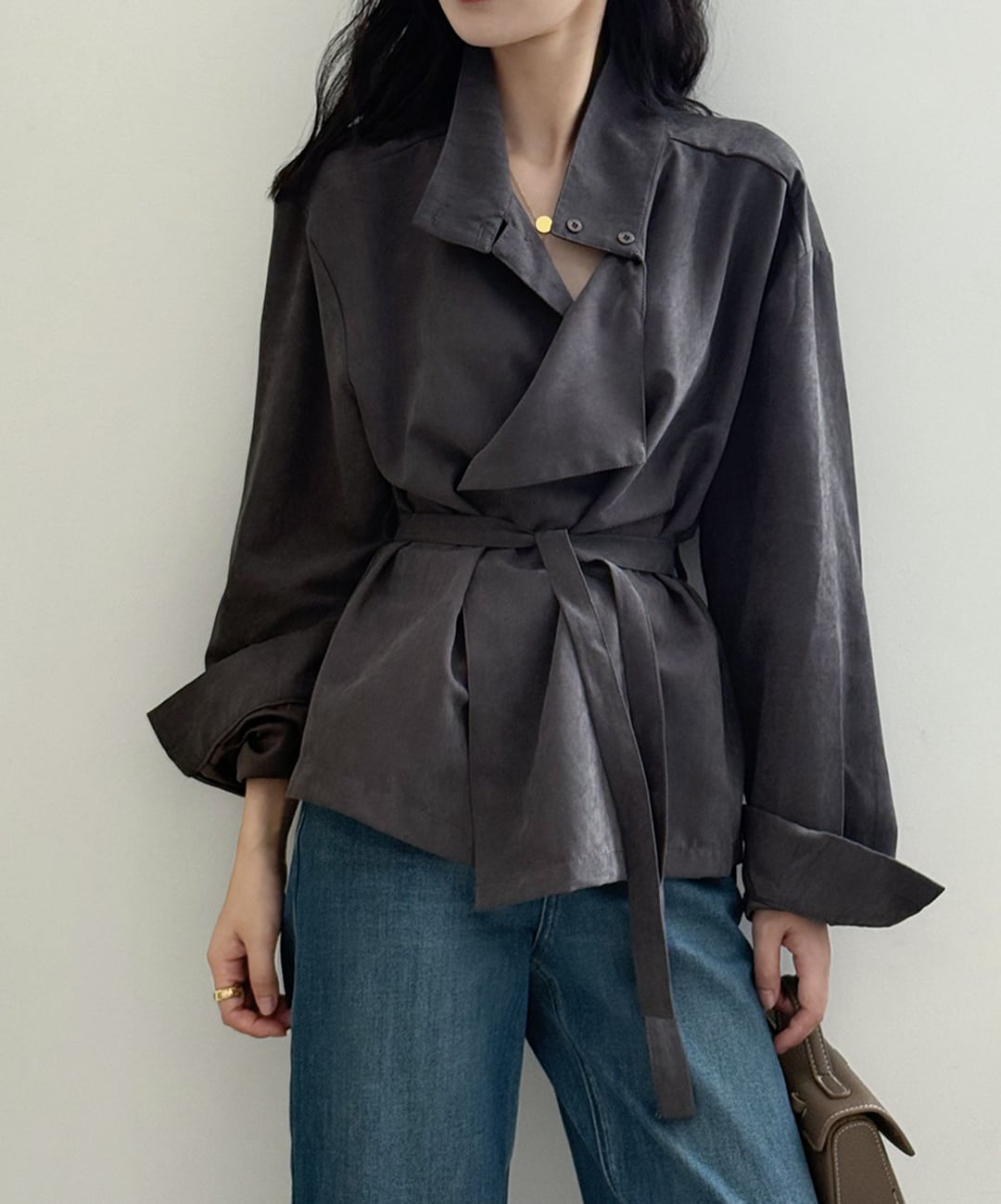 立体的なドレープとウエストリボンが印象的なシャツジャケット。