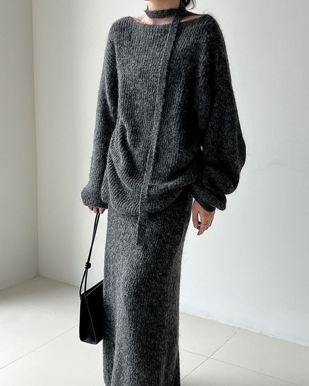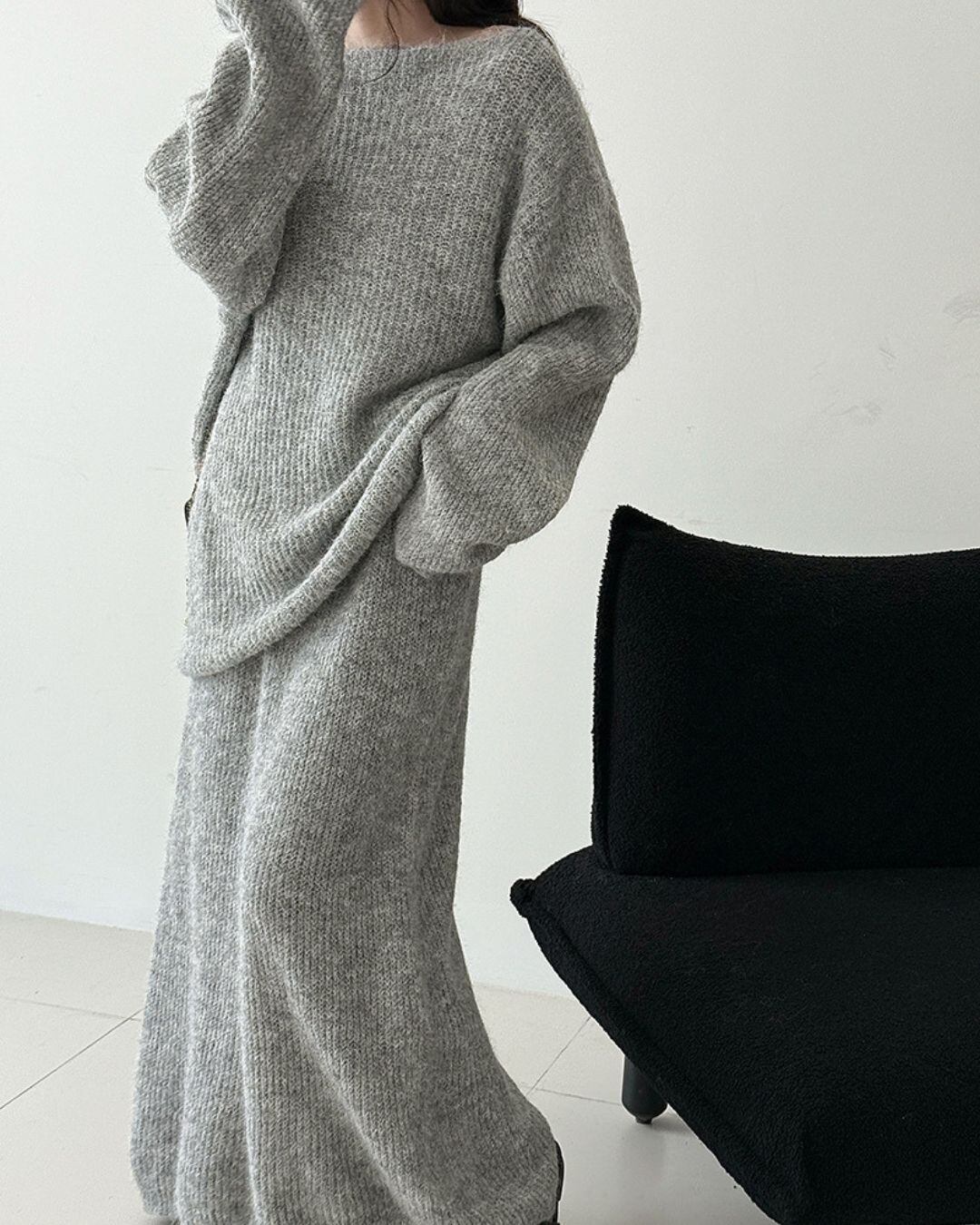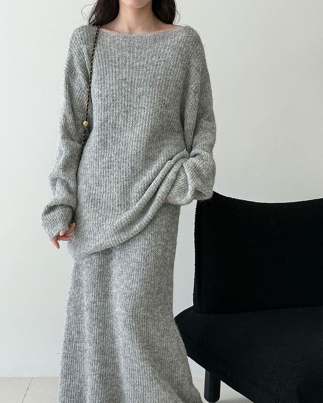 オフショルダーの抜け感が美しい、リラックスムード漂うニットセットアップです。