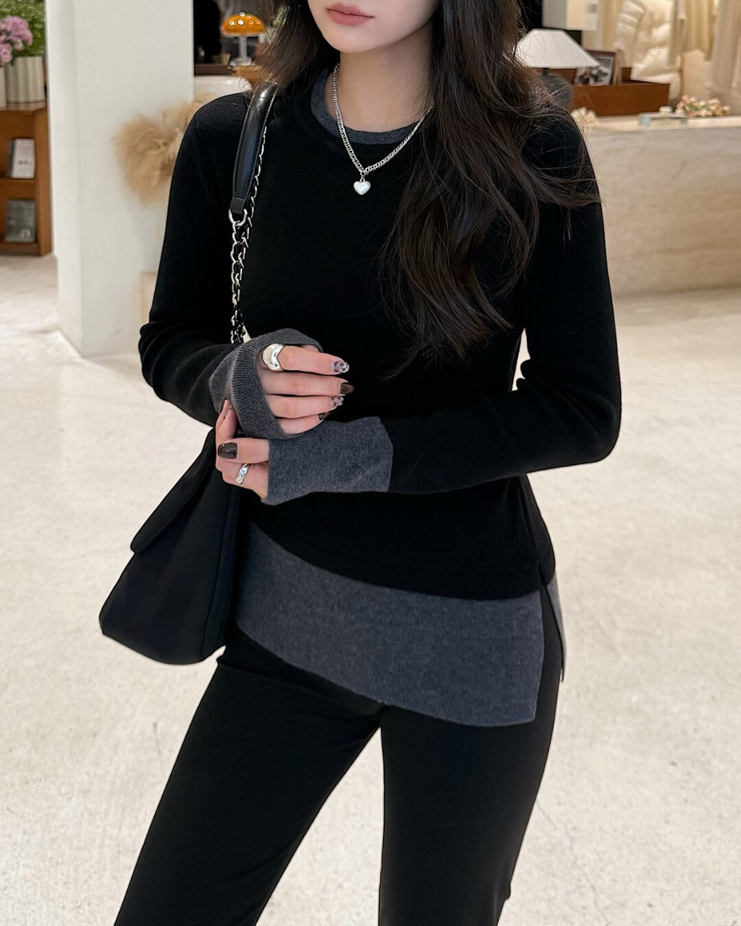 グレーのインナーを重ね着したようなバイカラーデザインで、