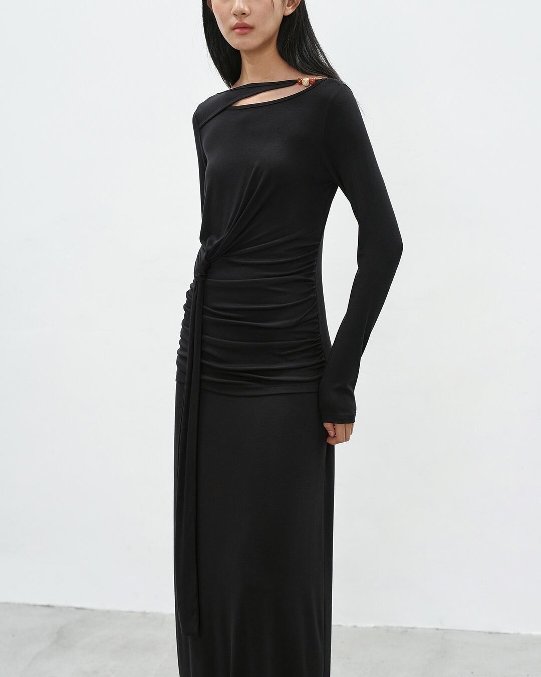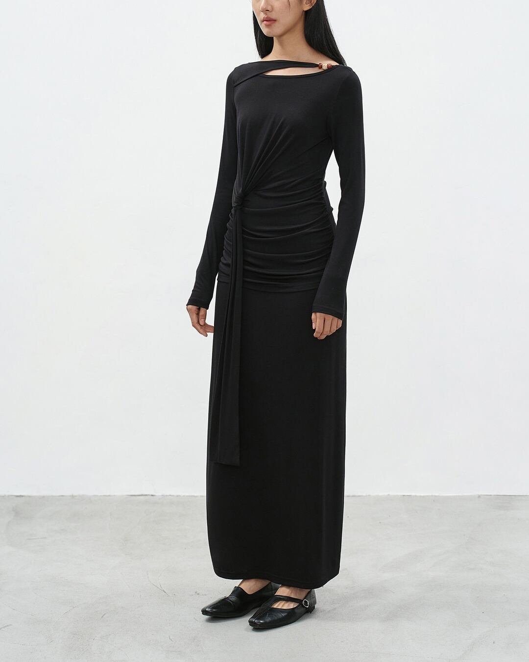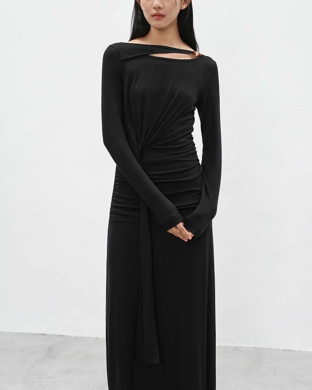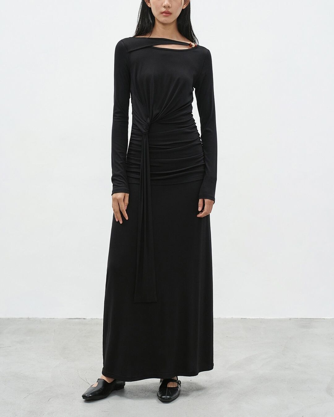 アシンメトリーなネックラインが目を引く長袖マキシ丈ワンピース。