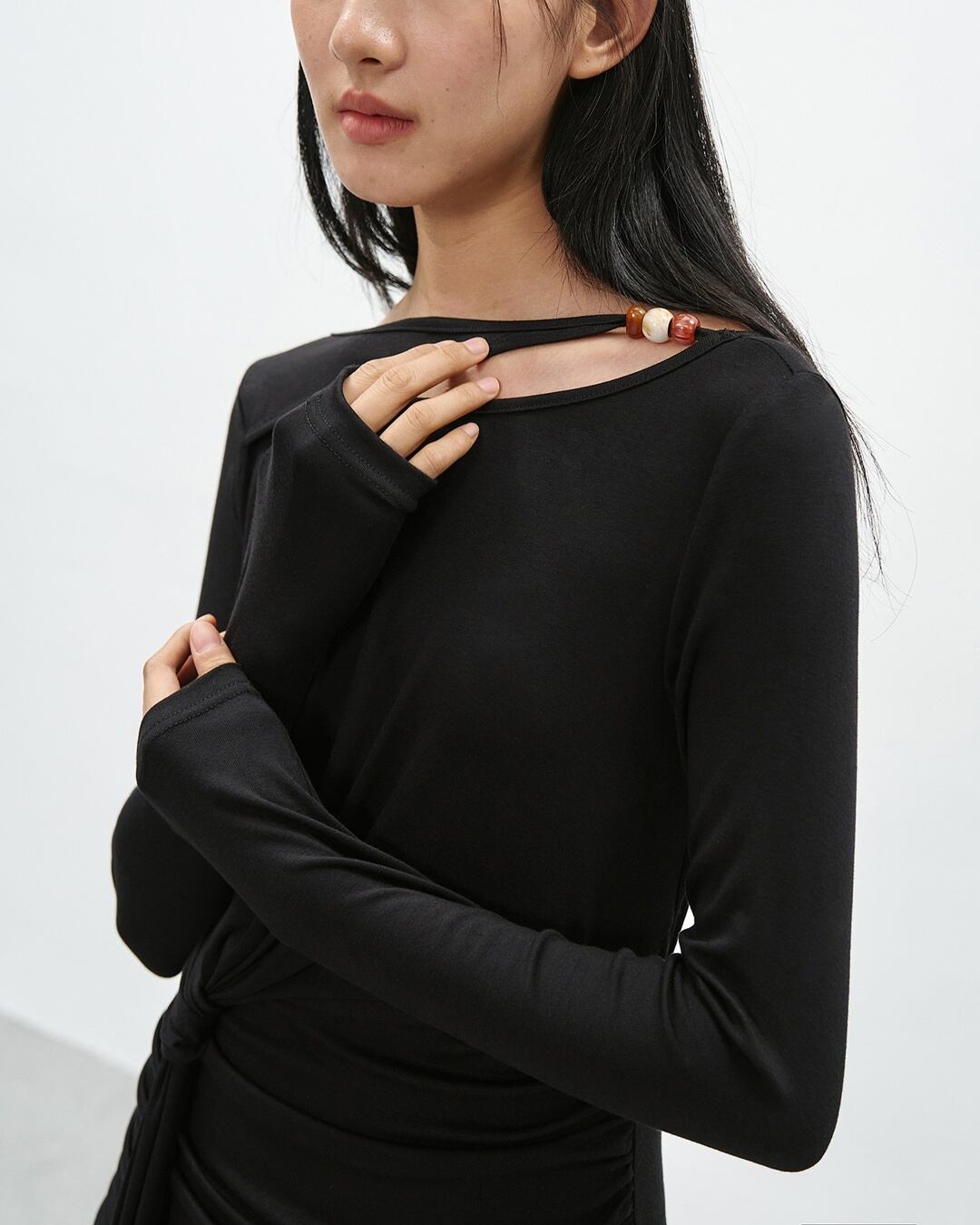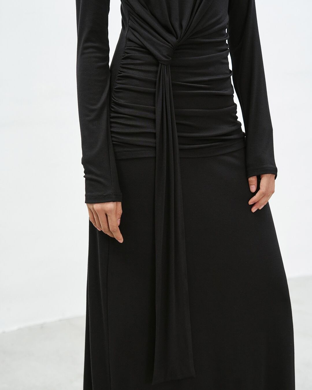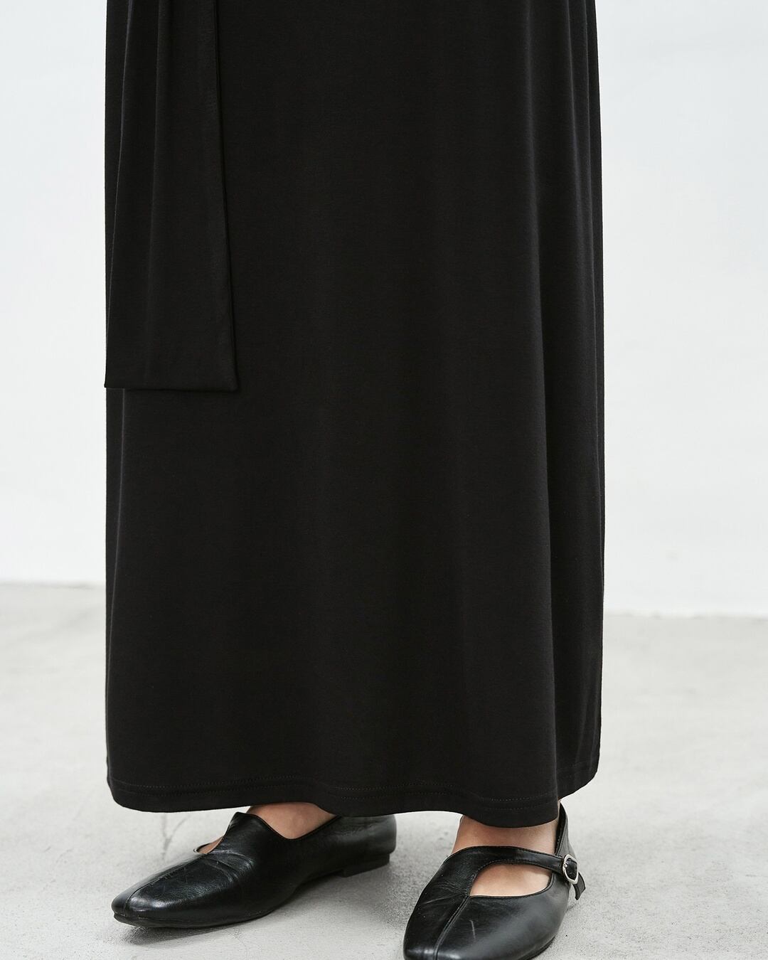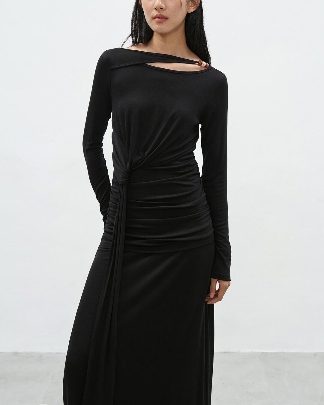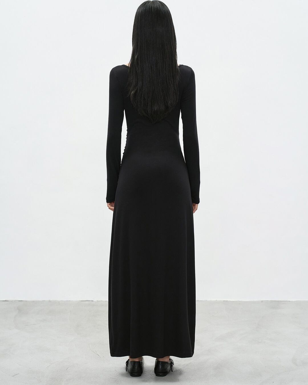 アシンメトリーなネックラインが目を引く長袖マキシ丈ワンピース。