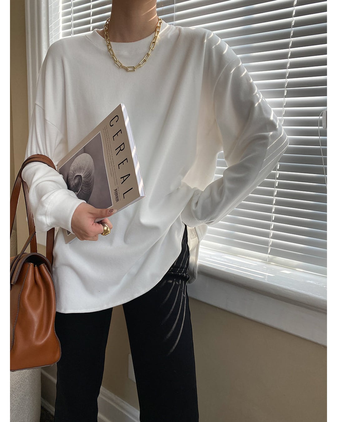 首元を優しく包み込むタートルネックのニット。