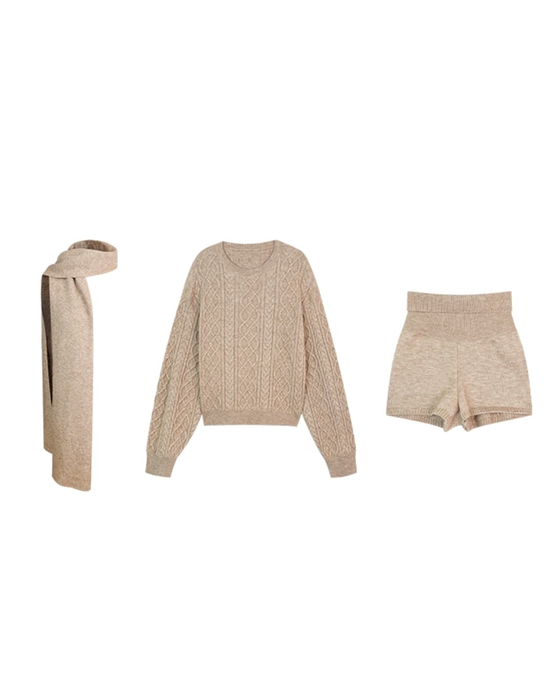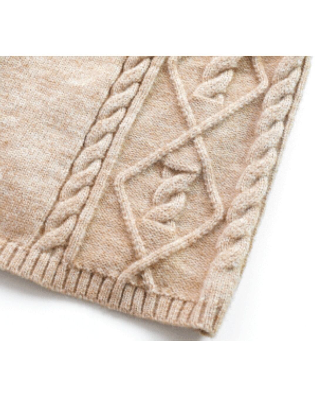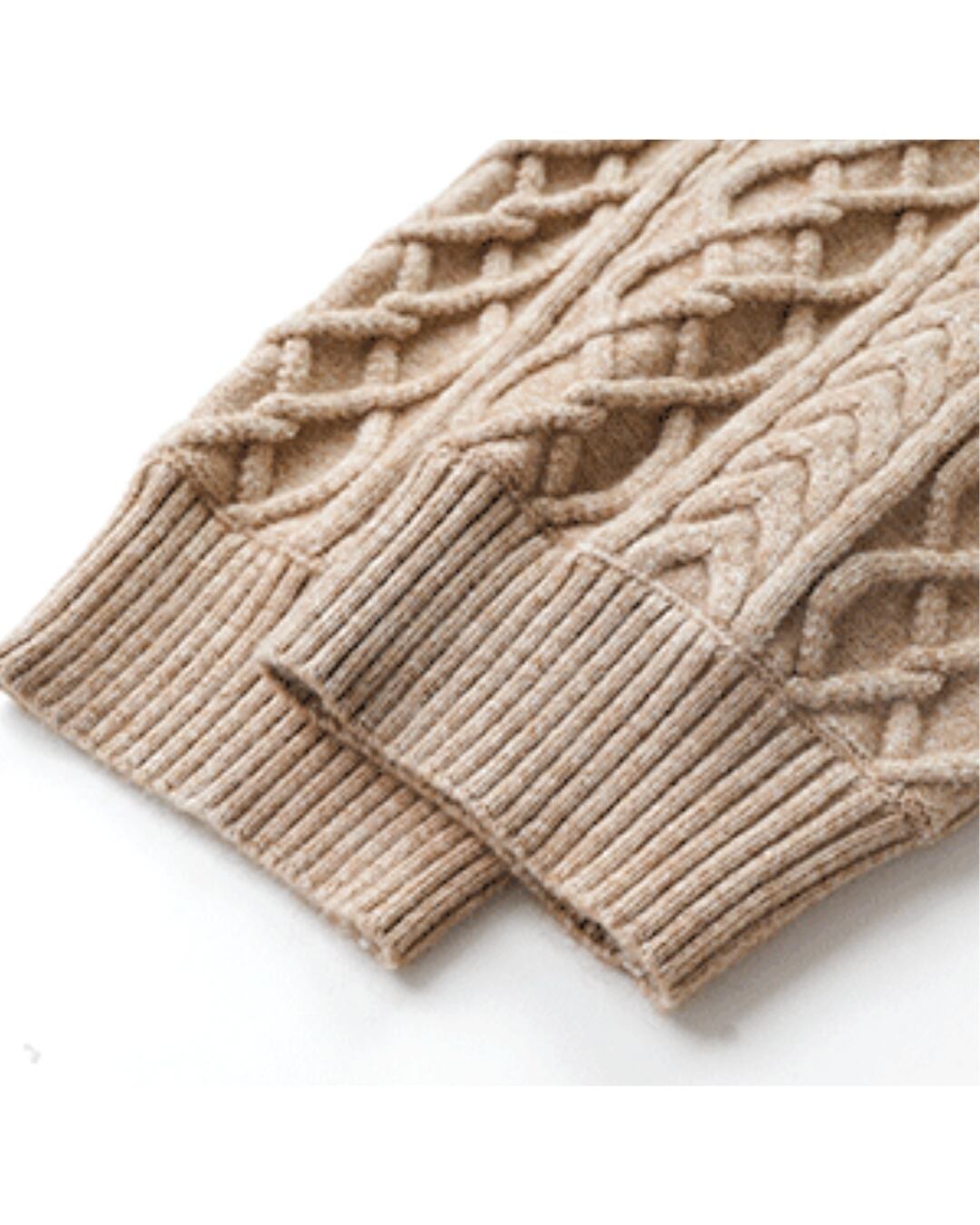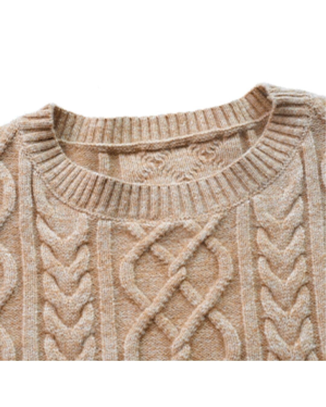 ケーブル編みがアクセントになり、シンプルながらも表情豊かな印象を与えます。