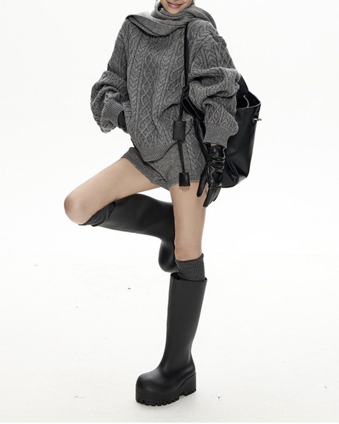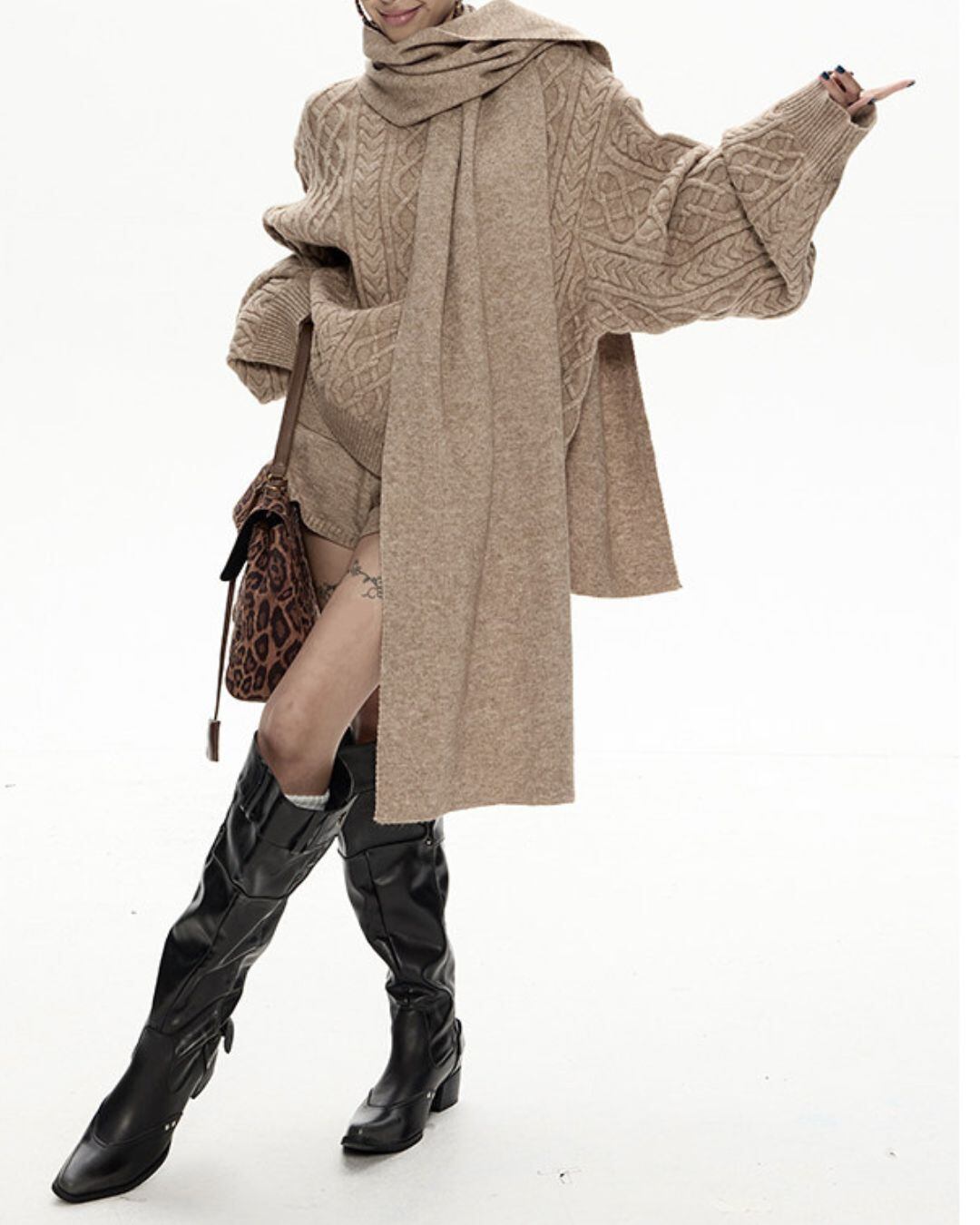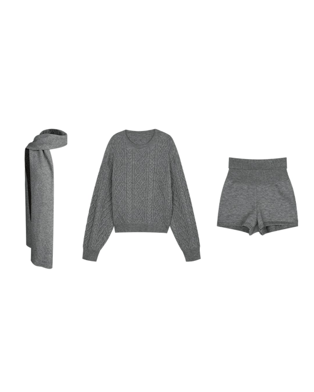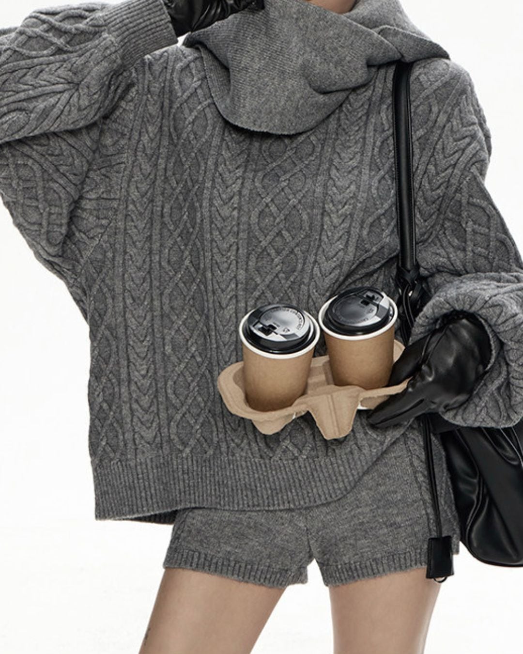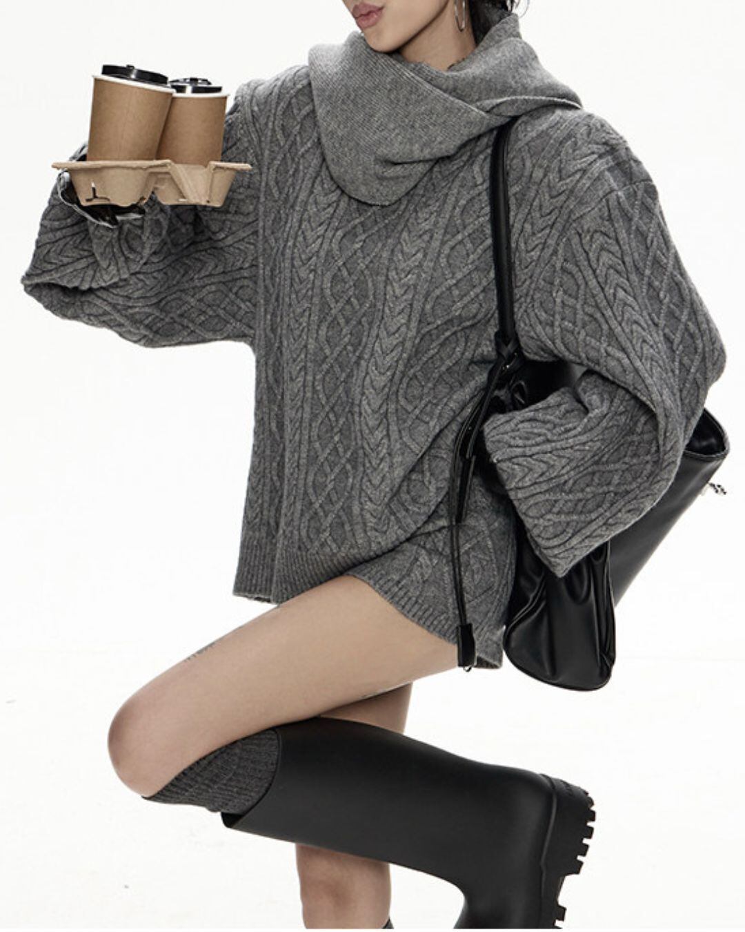 ケーブル編みがアクセントになり、シンプルながらも表情豊かな印象を与えます。