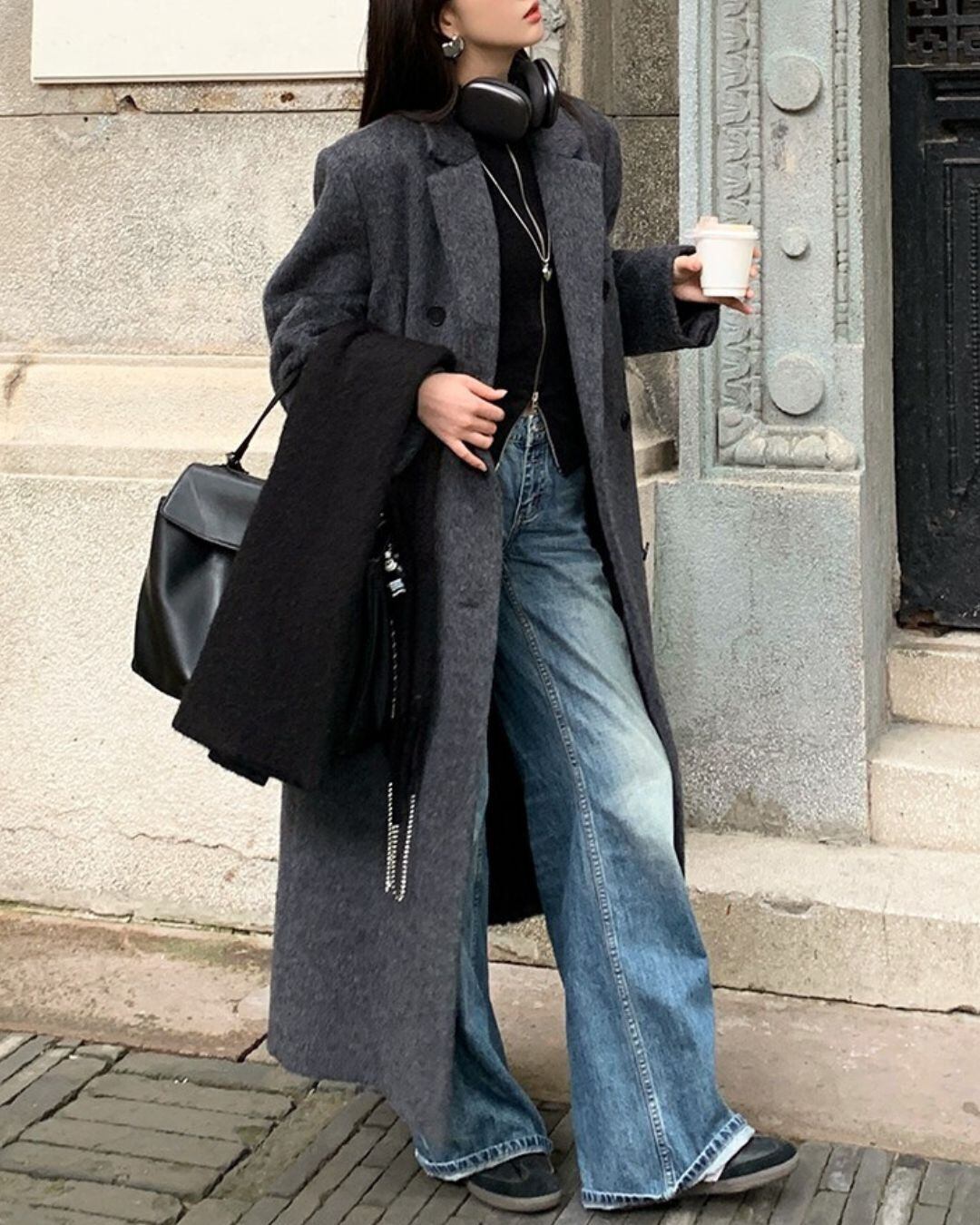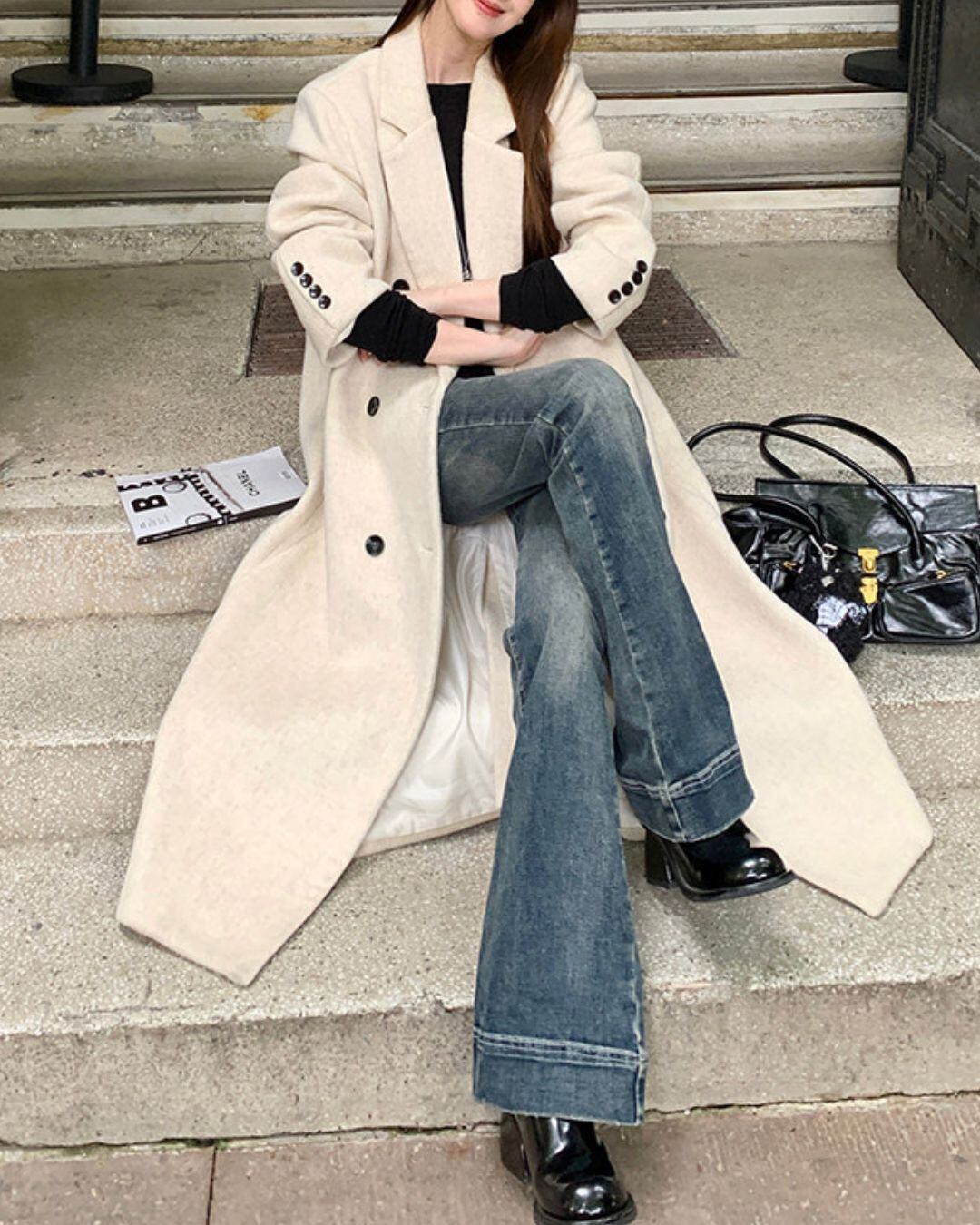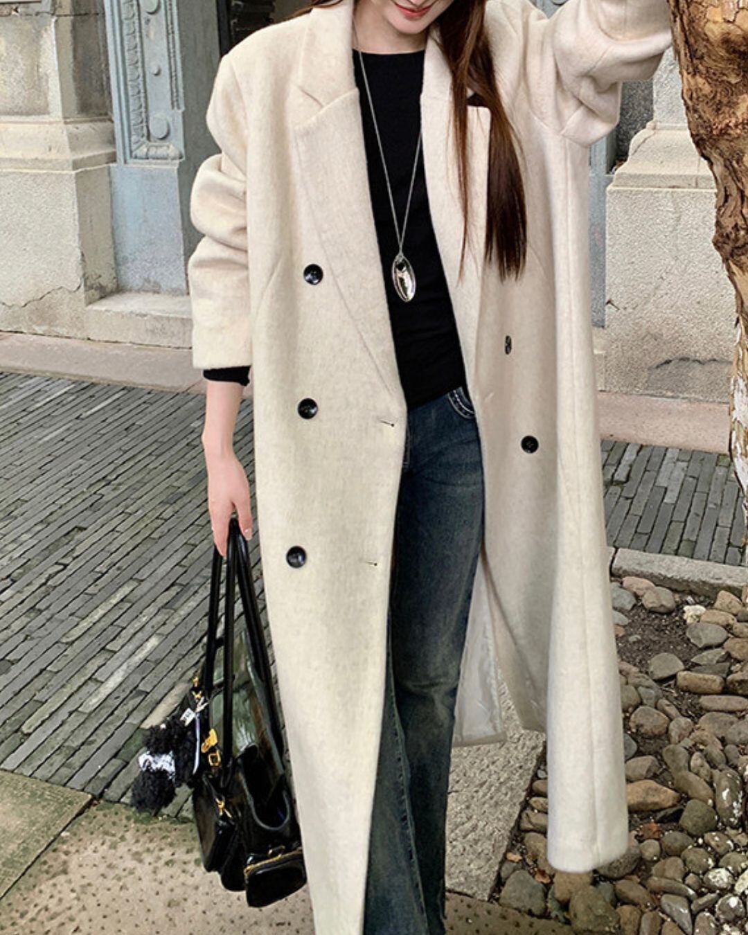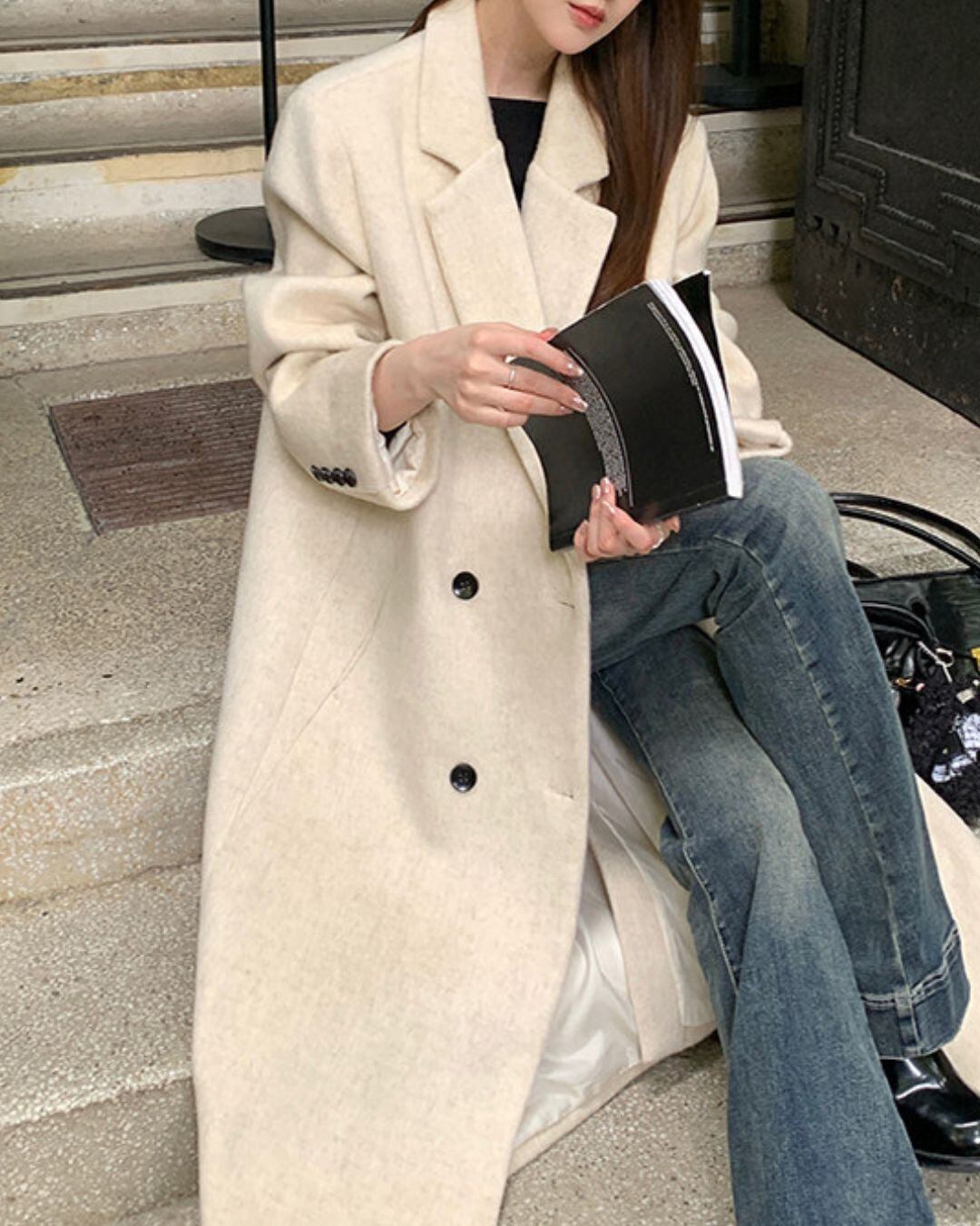 ミニマルなデザインが魅力のロングウールコート。