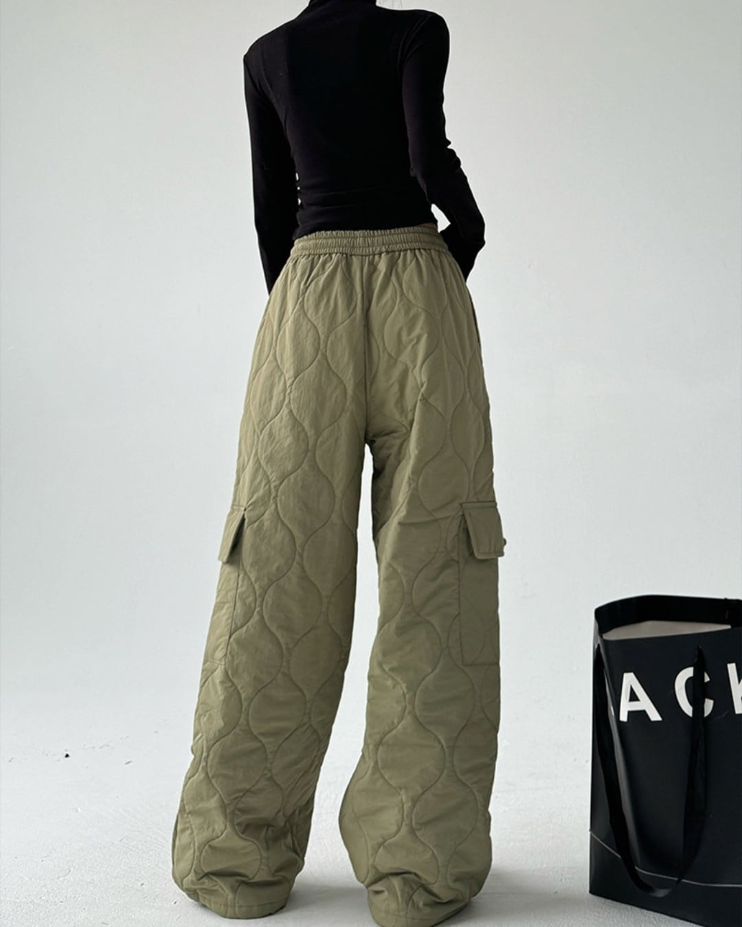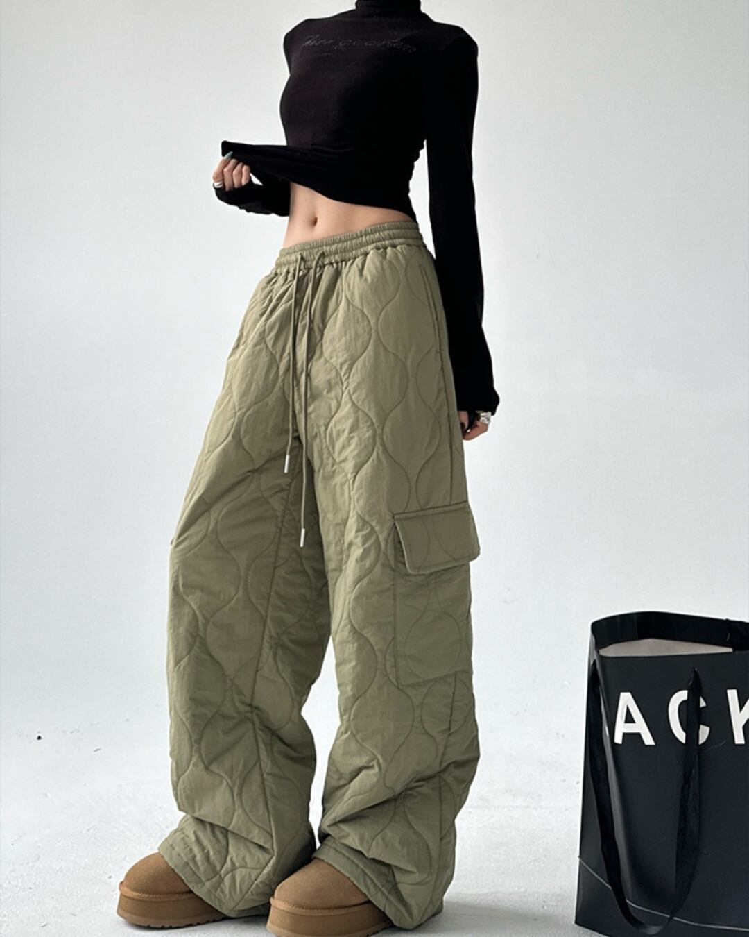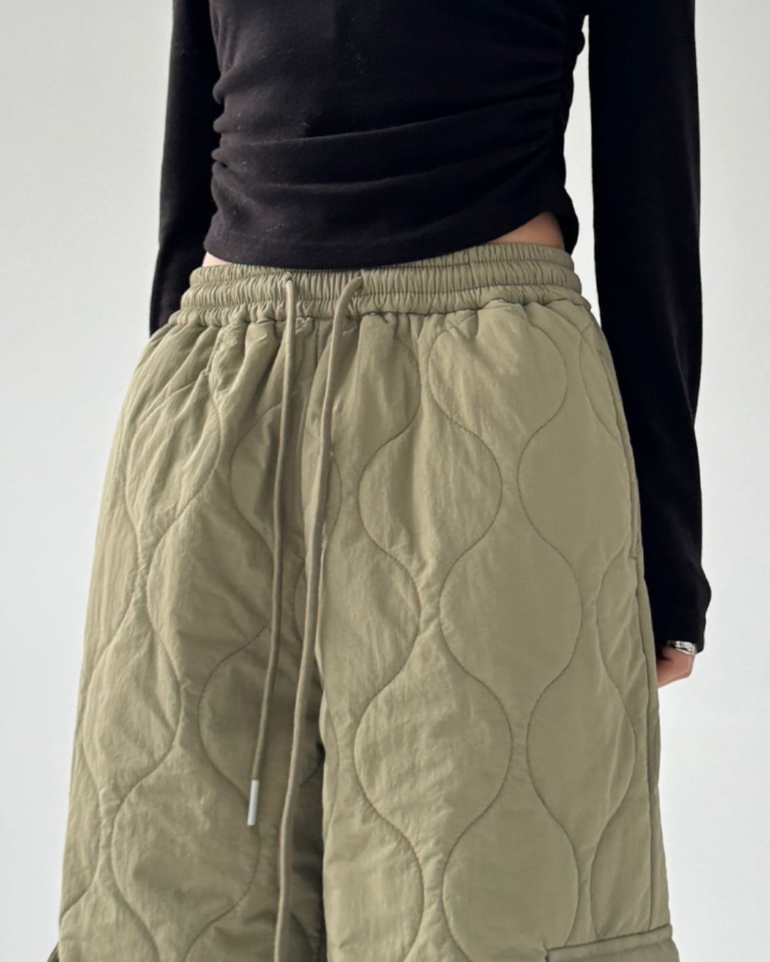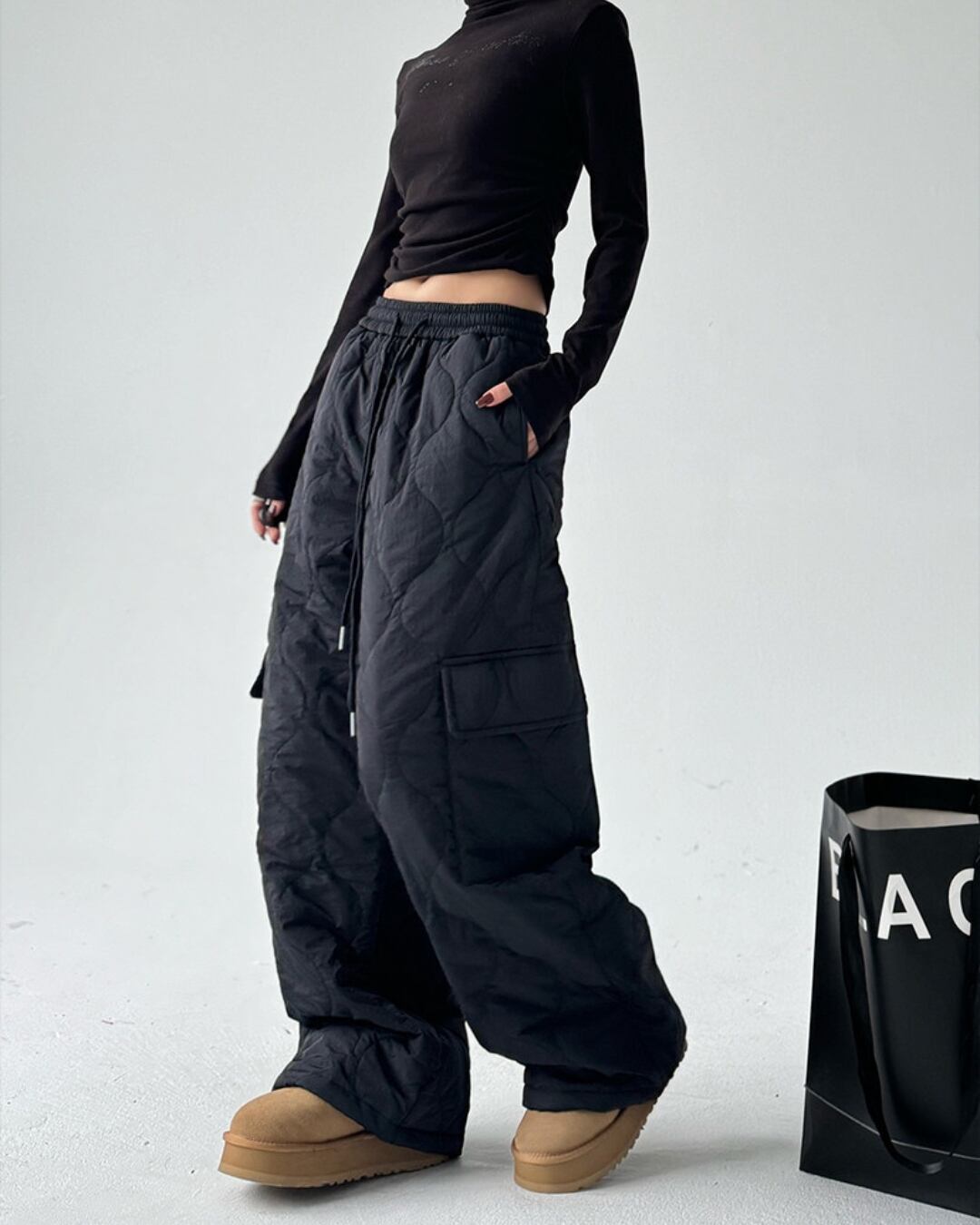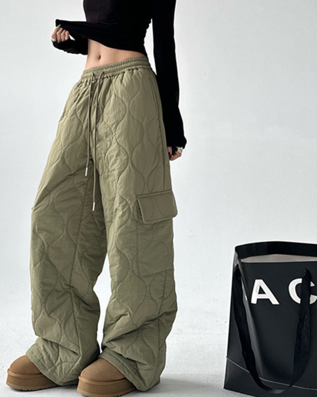 キルティングデザインが目を引くワイドストレートパンツです。