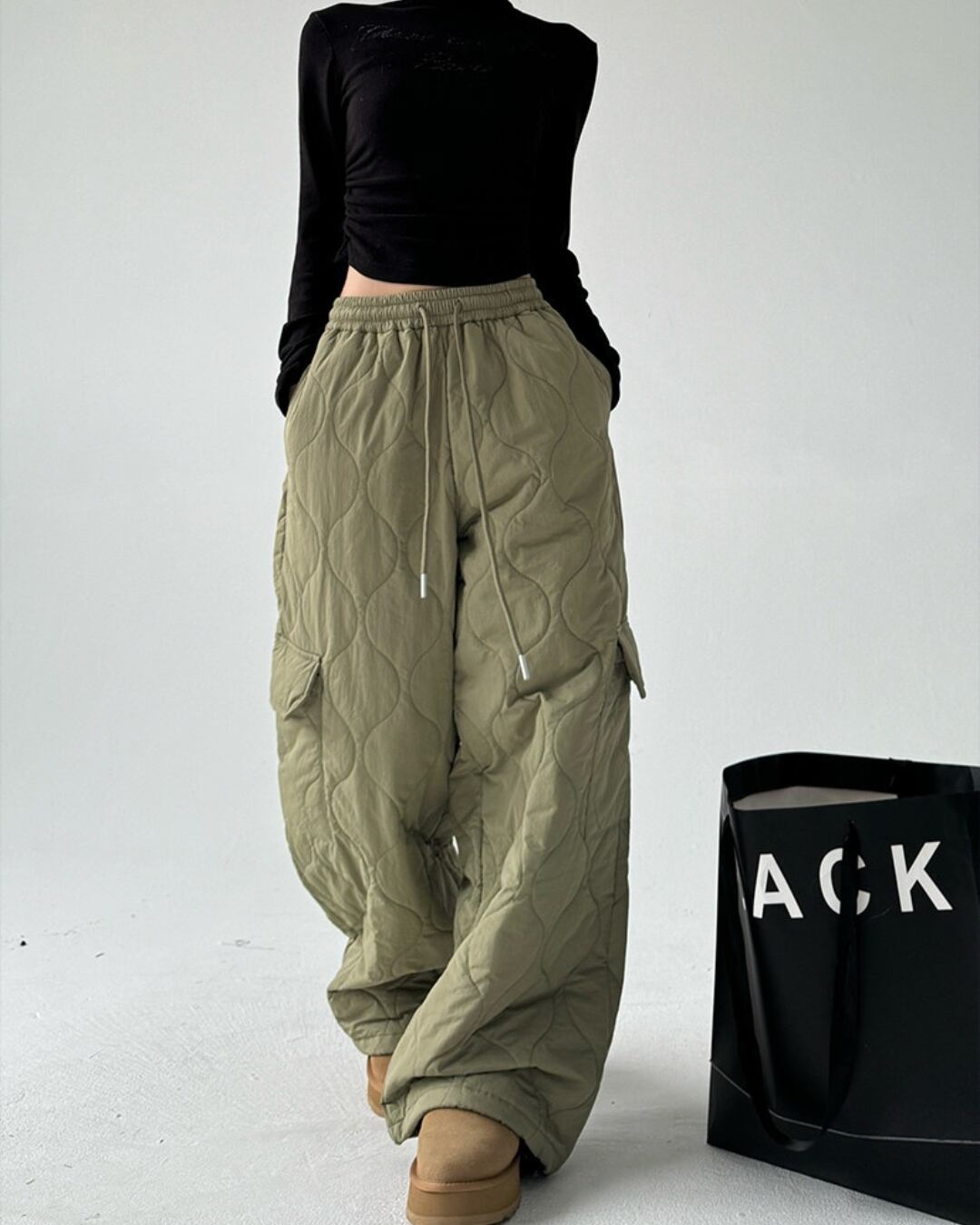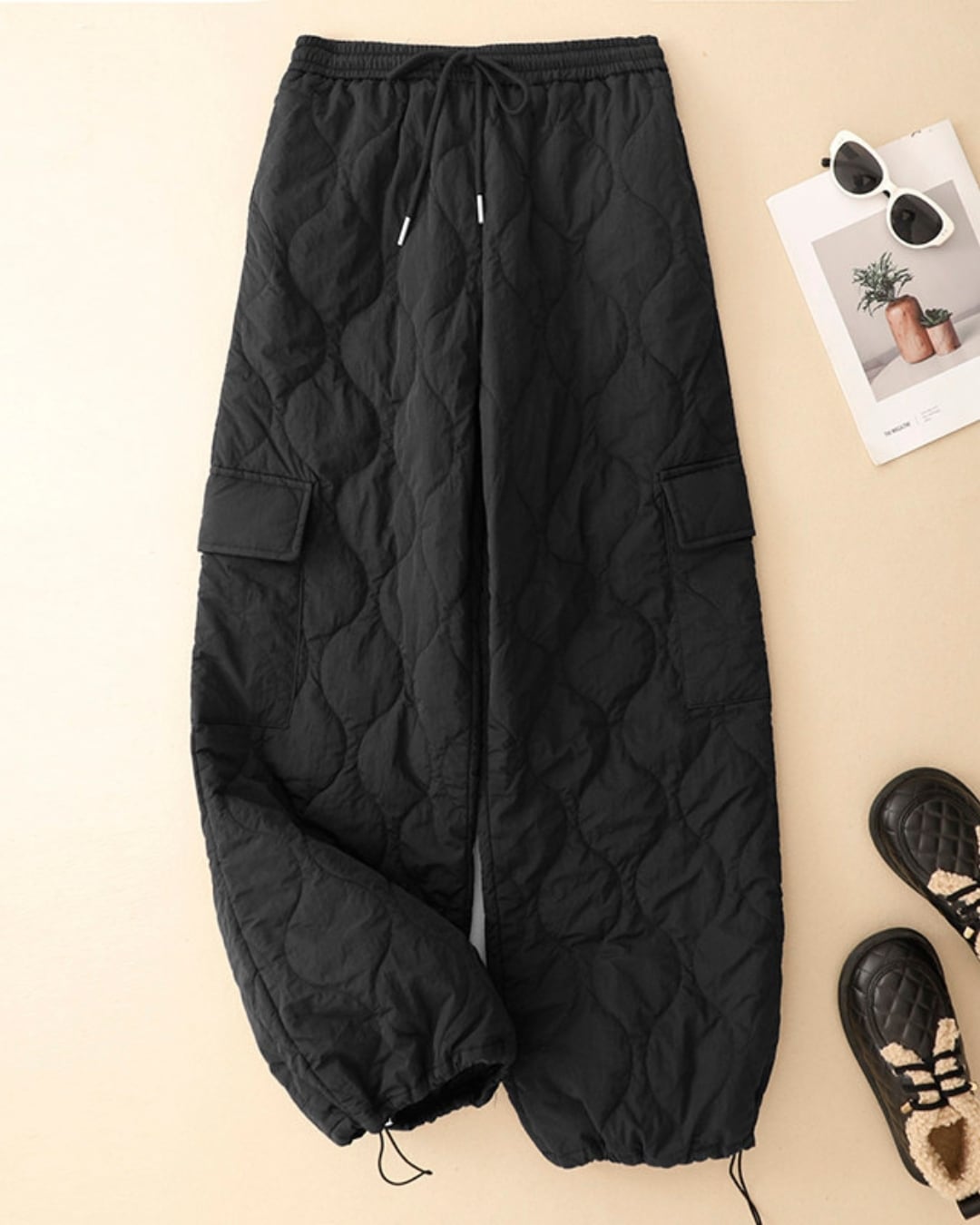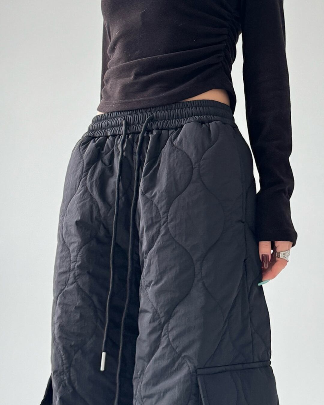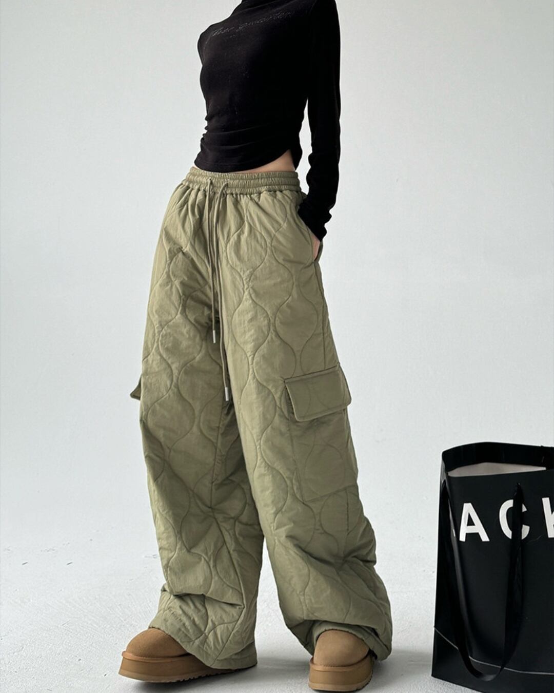 キルティングデザインが目を引くワイドストレートパンツです。