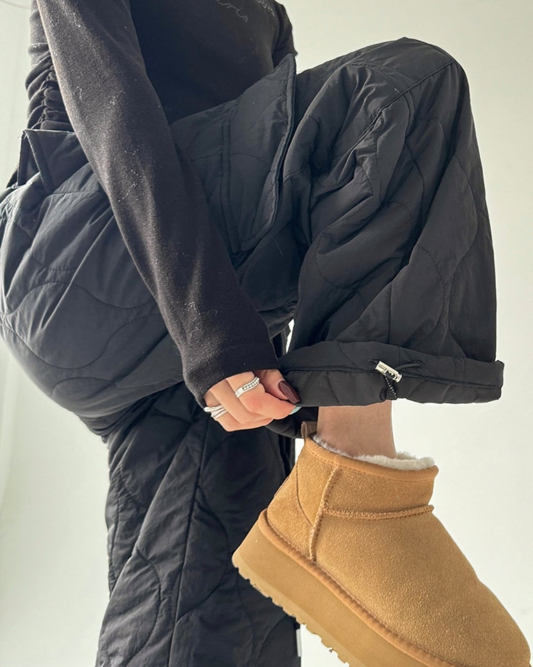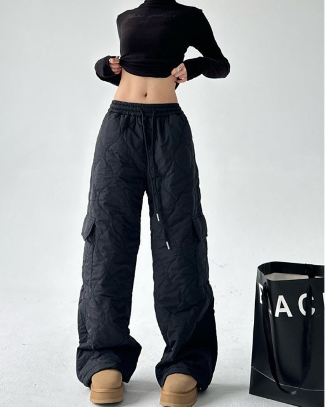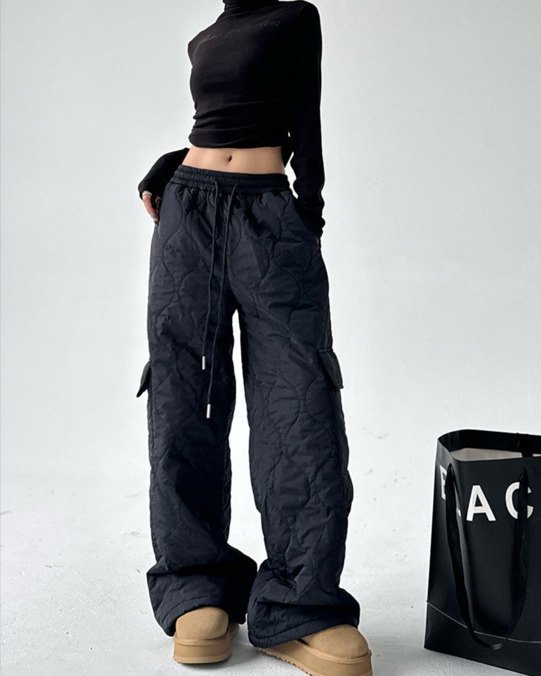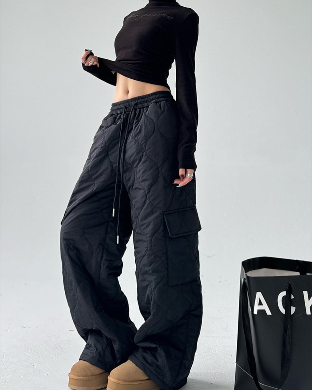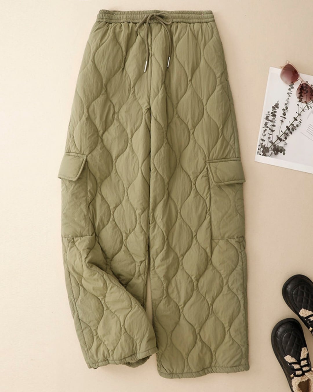 キルティングデザインが目を引くワイドストレートパンツです。