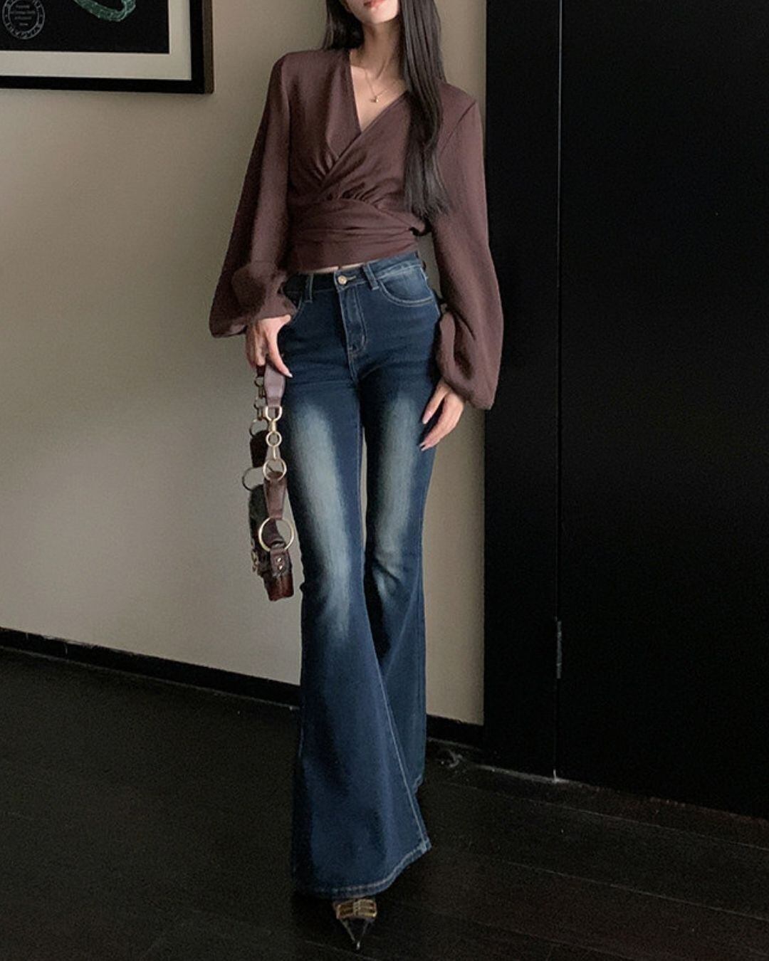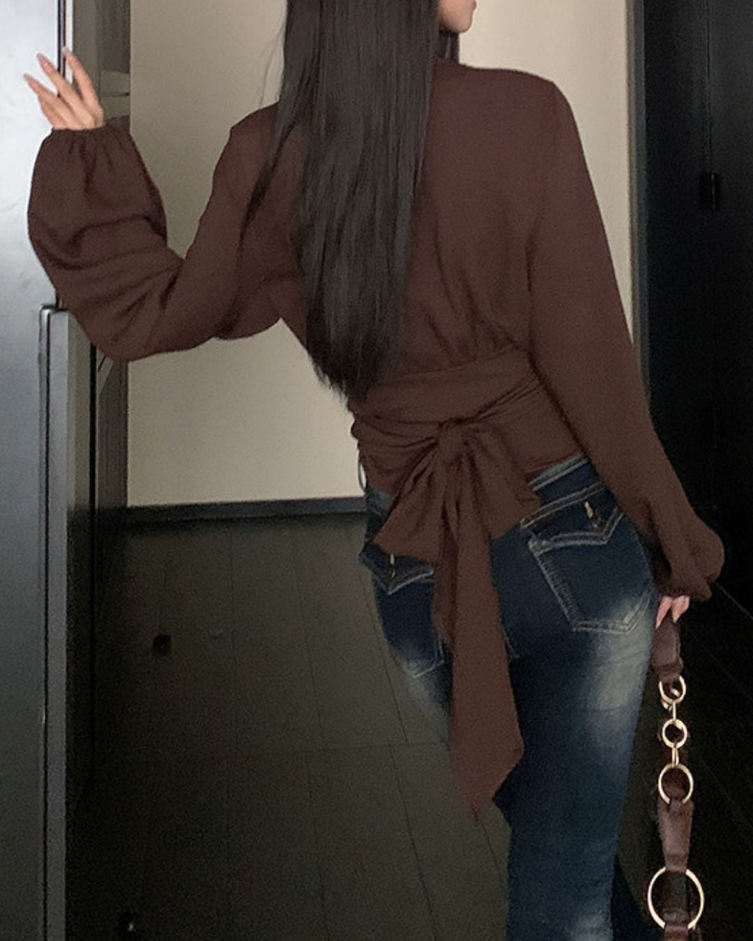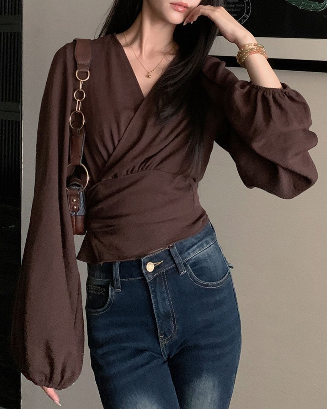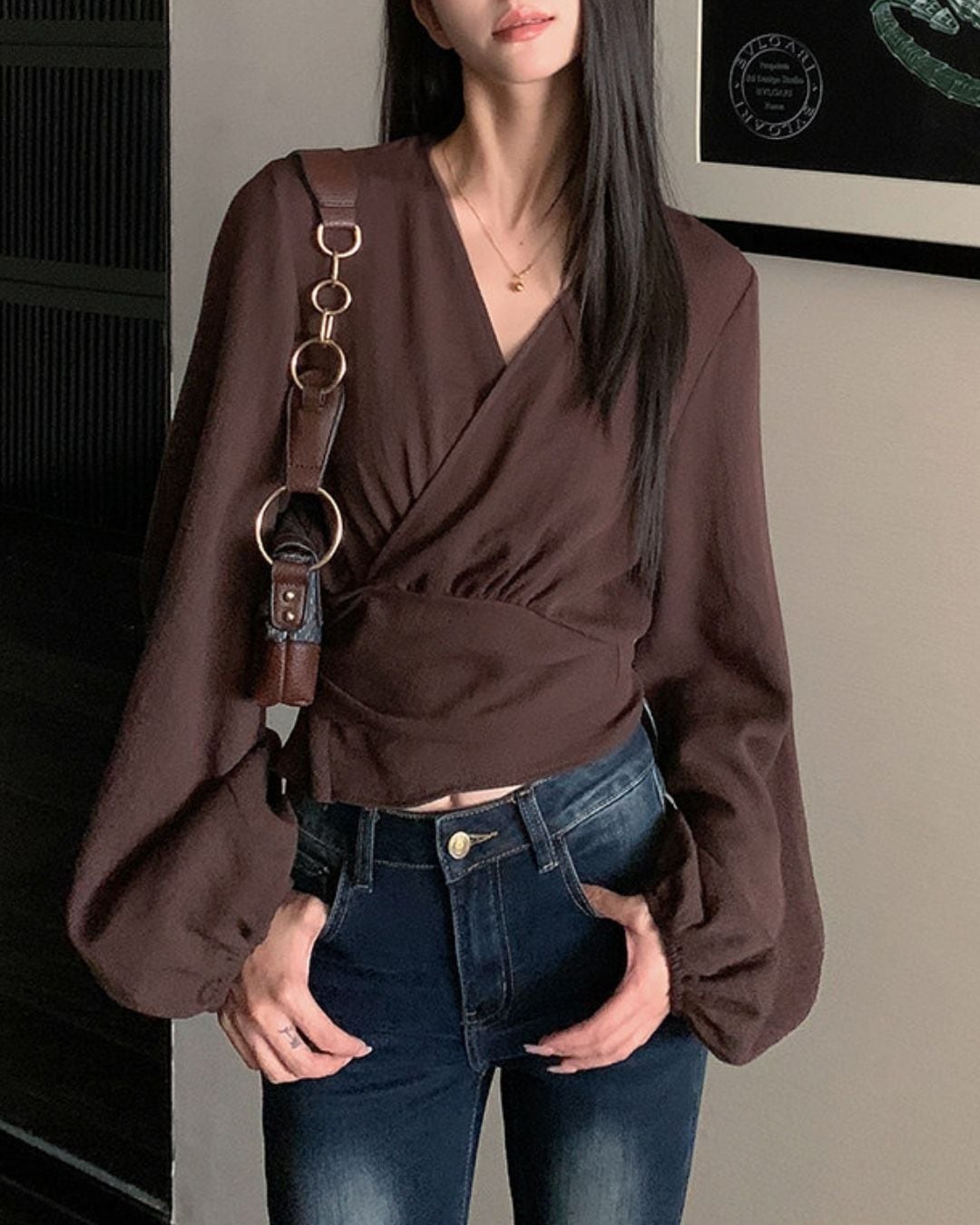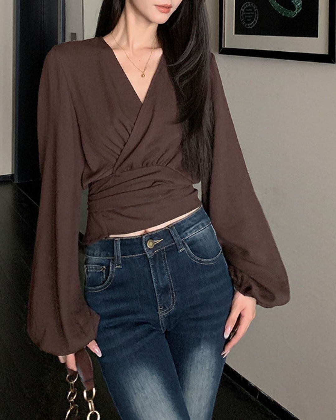 ラップデザインが目を引く長袖ブラウスです。