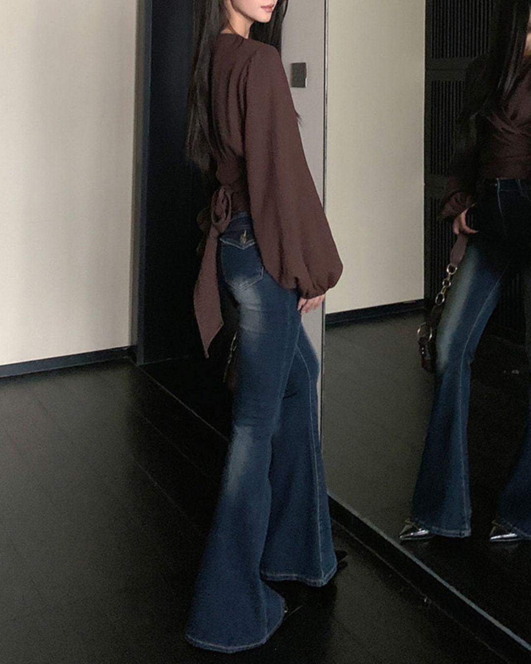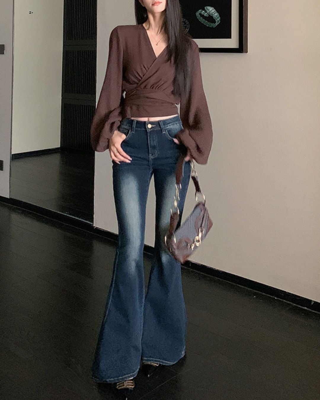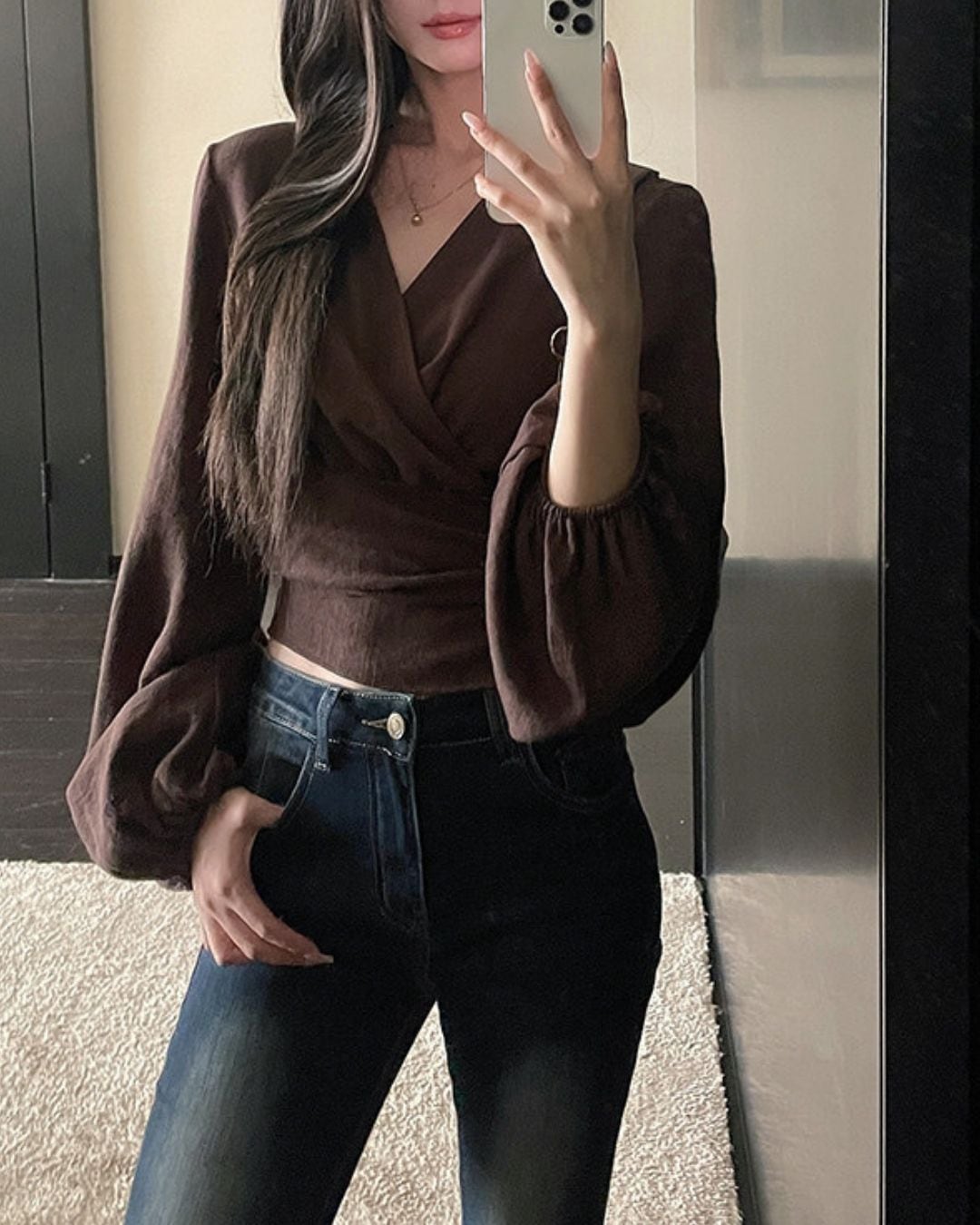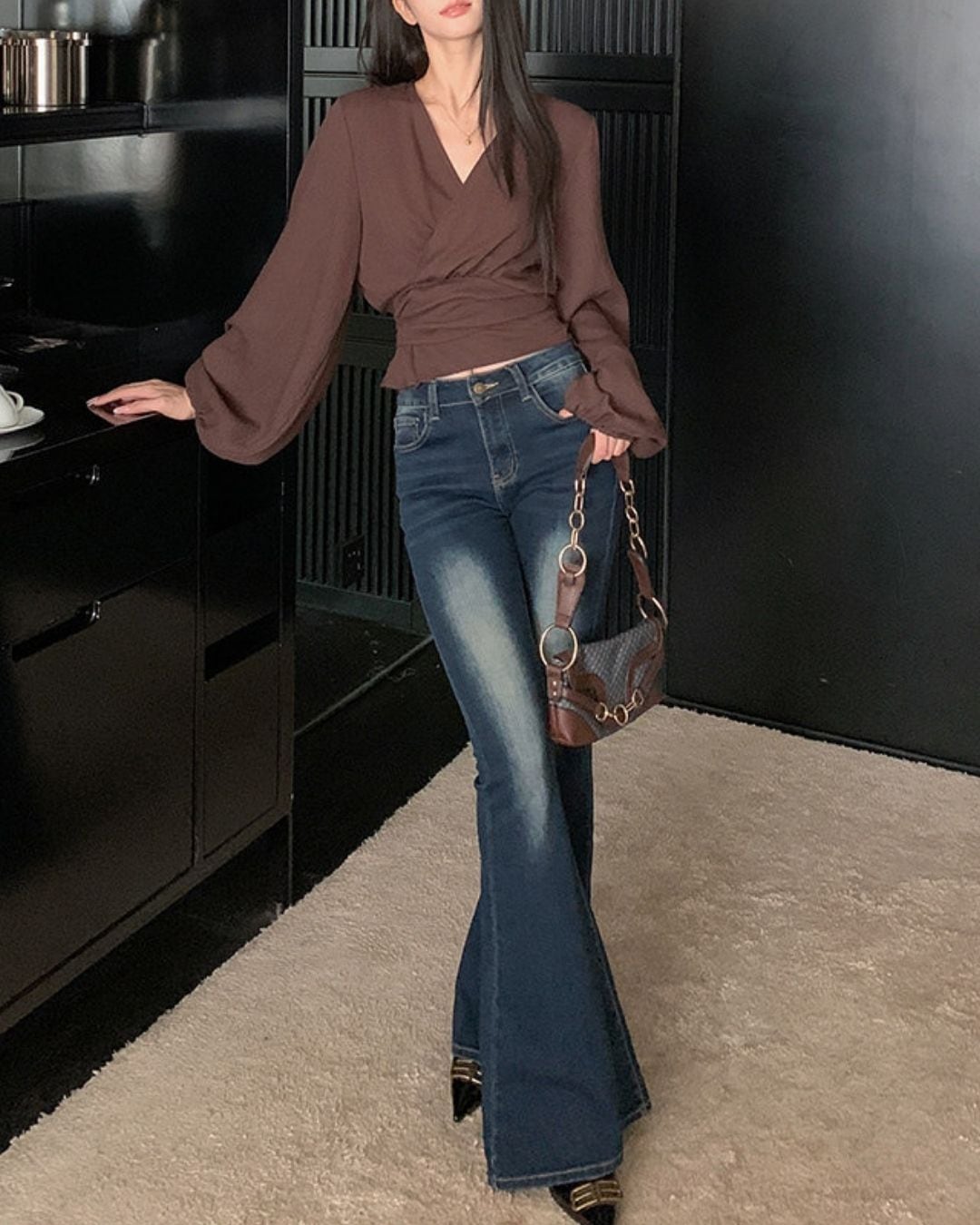 ラップデザインが目を引く長袖ブラウスです。