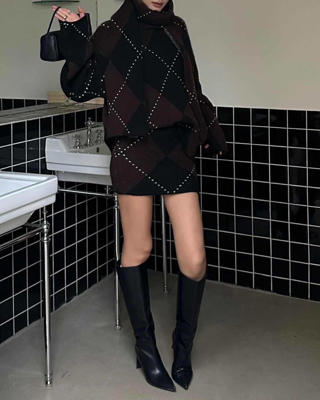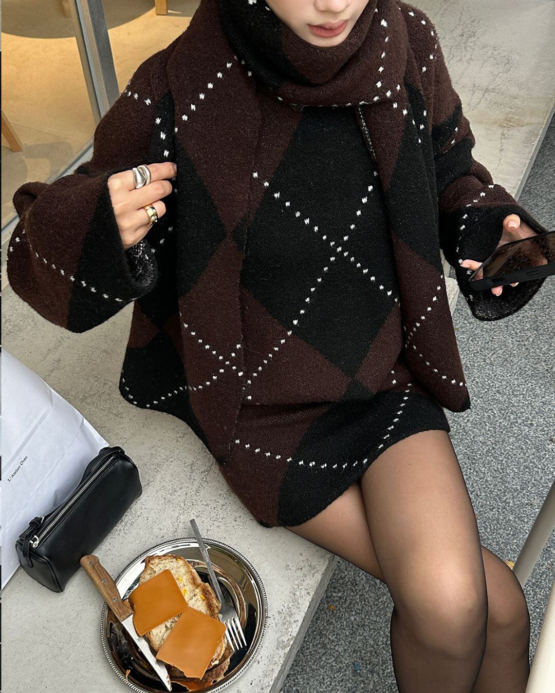 カジュアルながらも洗練された印象を与える、アーガイル柄のニットセットアップです。