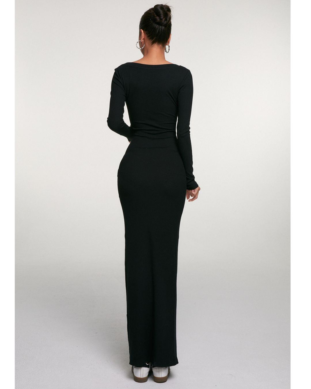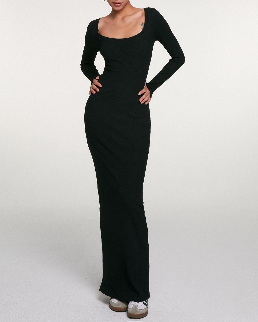 すっきりとしたシルエットが魅力のマキシ丈ワンピースです。