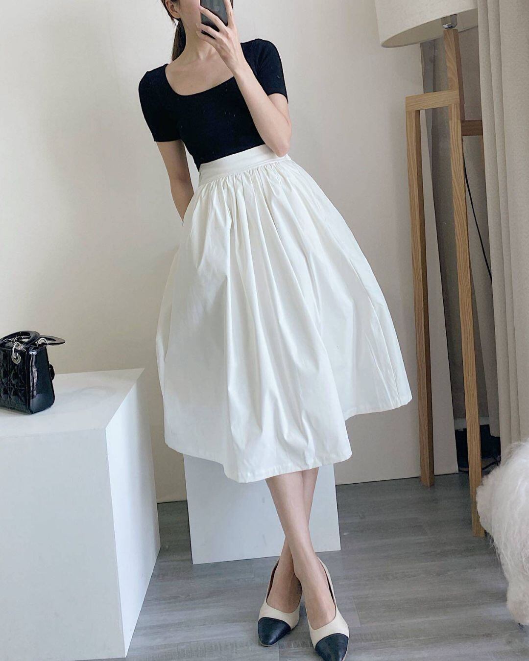 広がりすぎないフレアーラインが歩くたびに揺れ、女性らしい印象を与えます。