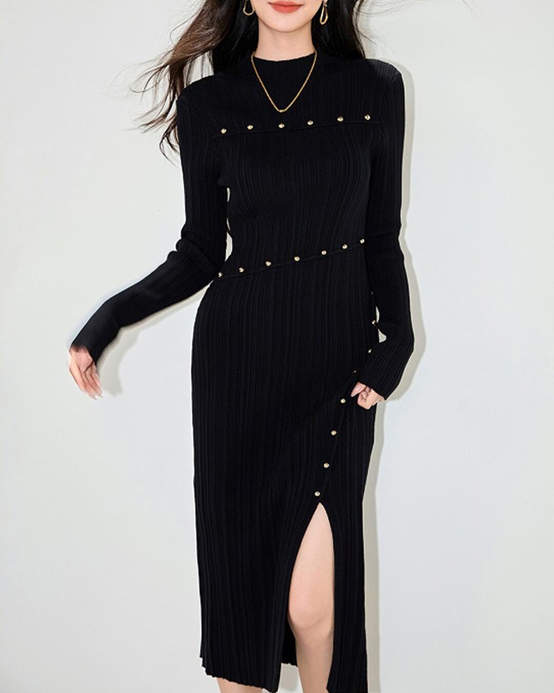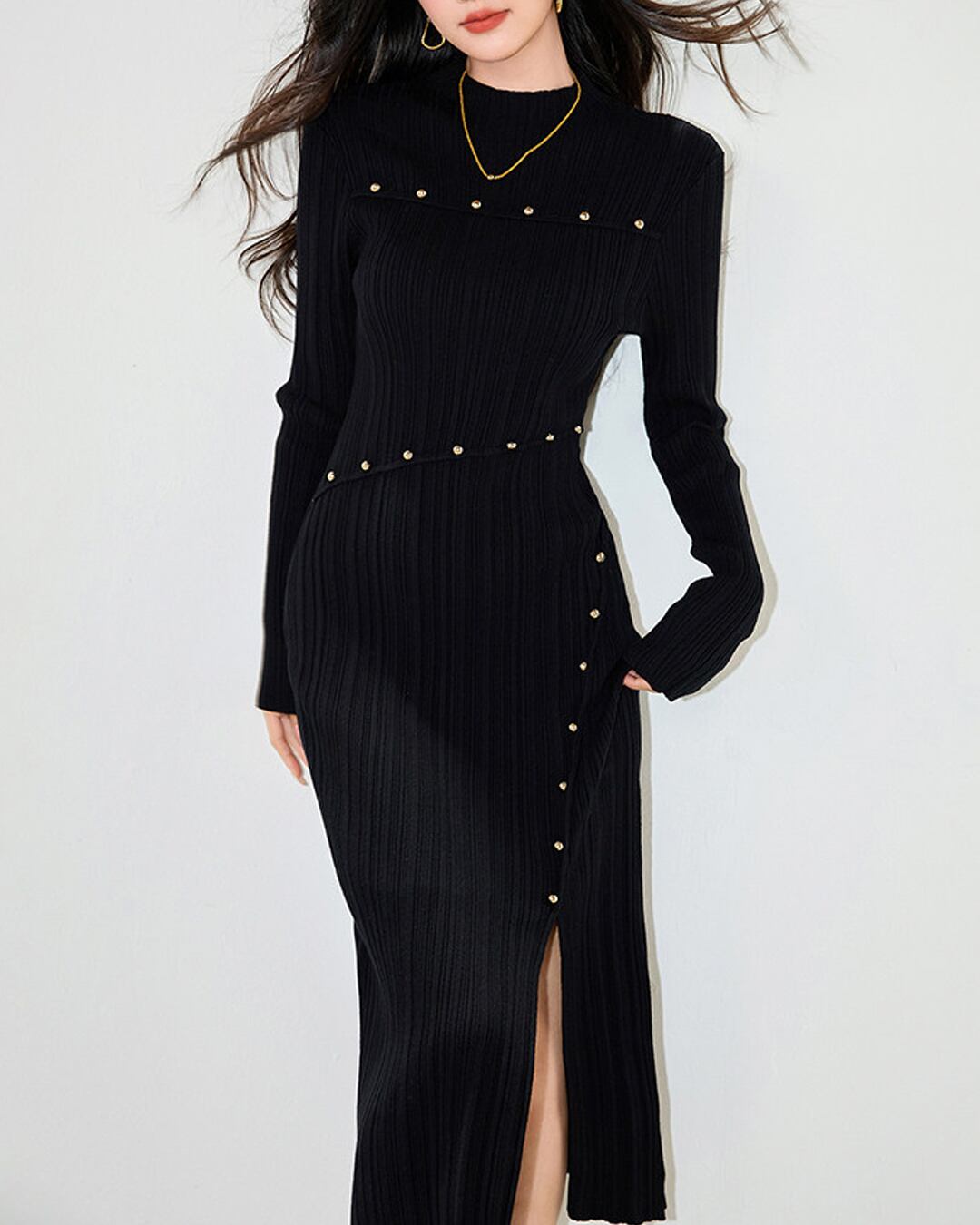 ボタン飾りがアクセントになった、ミモレ丈のニットワンピースです。