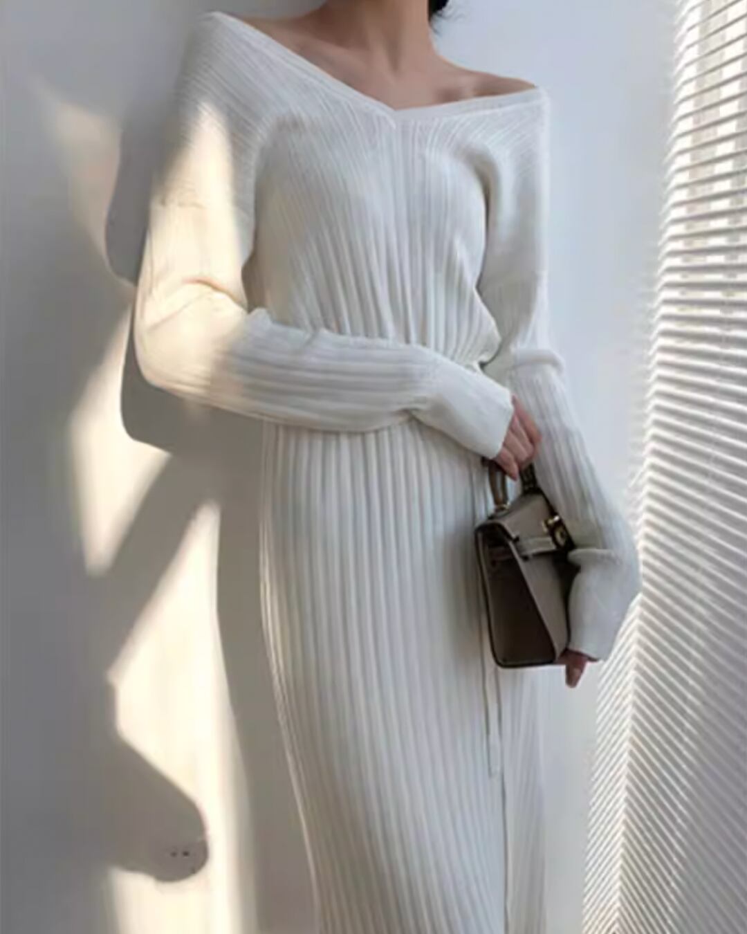 Vネックデザインがデコルテを美しく演出し、女性らしさを引き立てます。