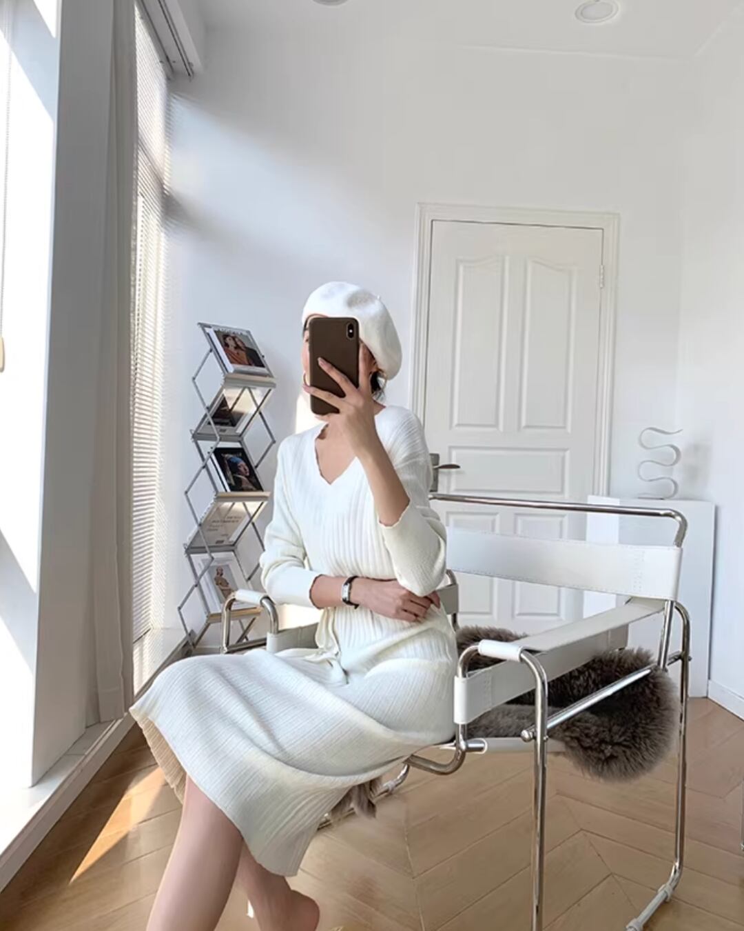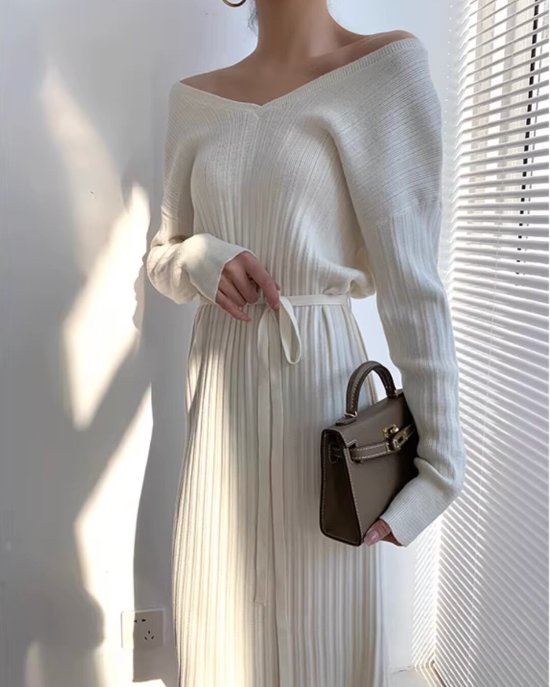 ベルト付きマキシ丈ニットワンピースです。