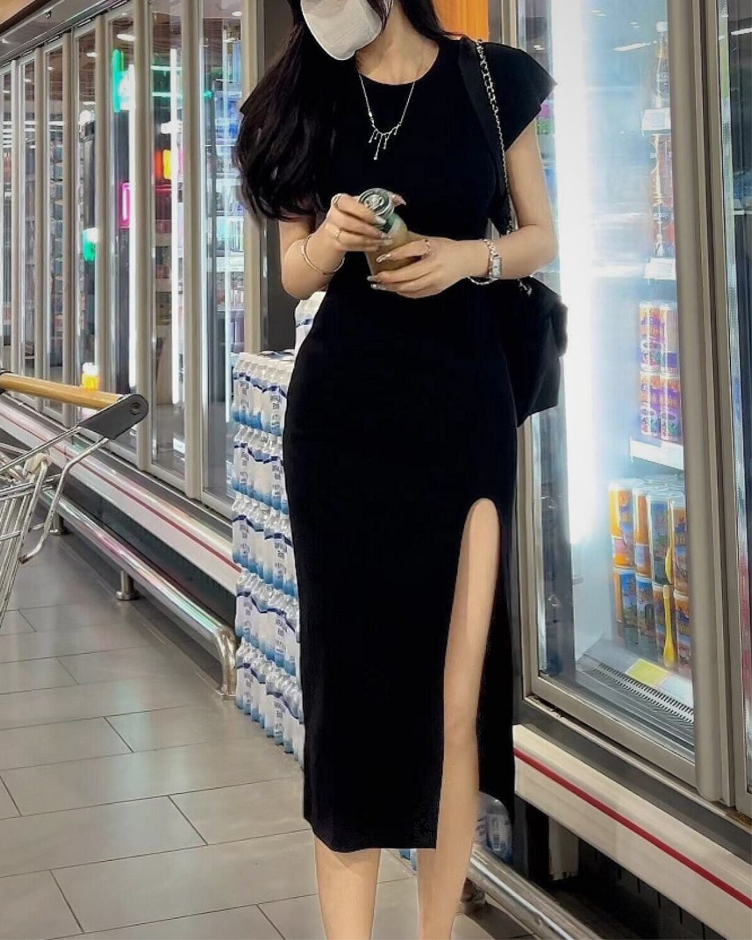 スリットが特徴的なミモレ丈の半袖タイトワンピースです。
