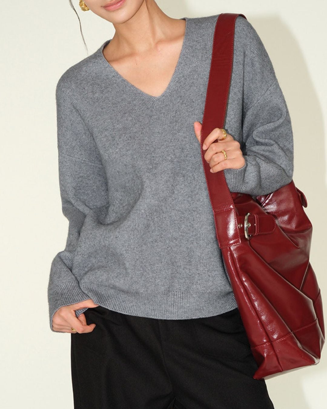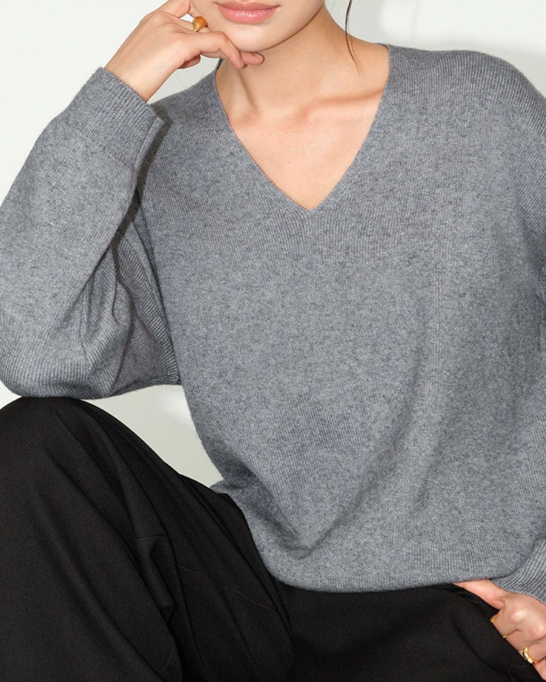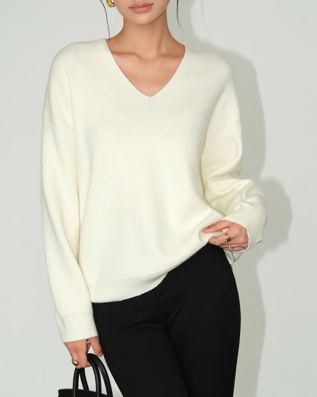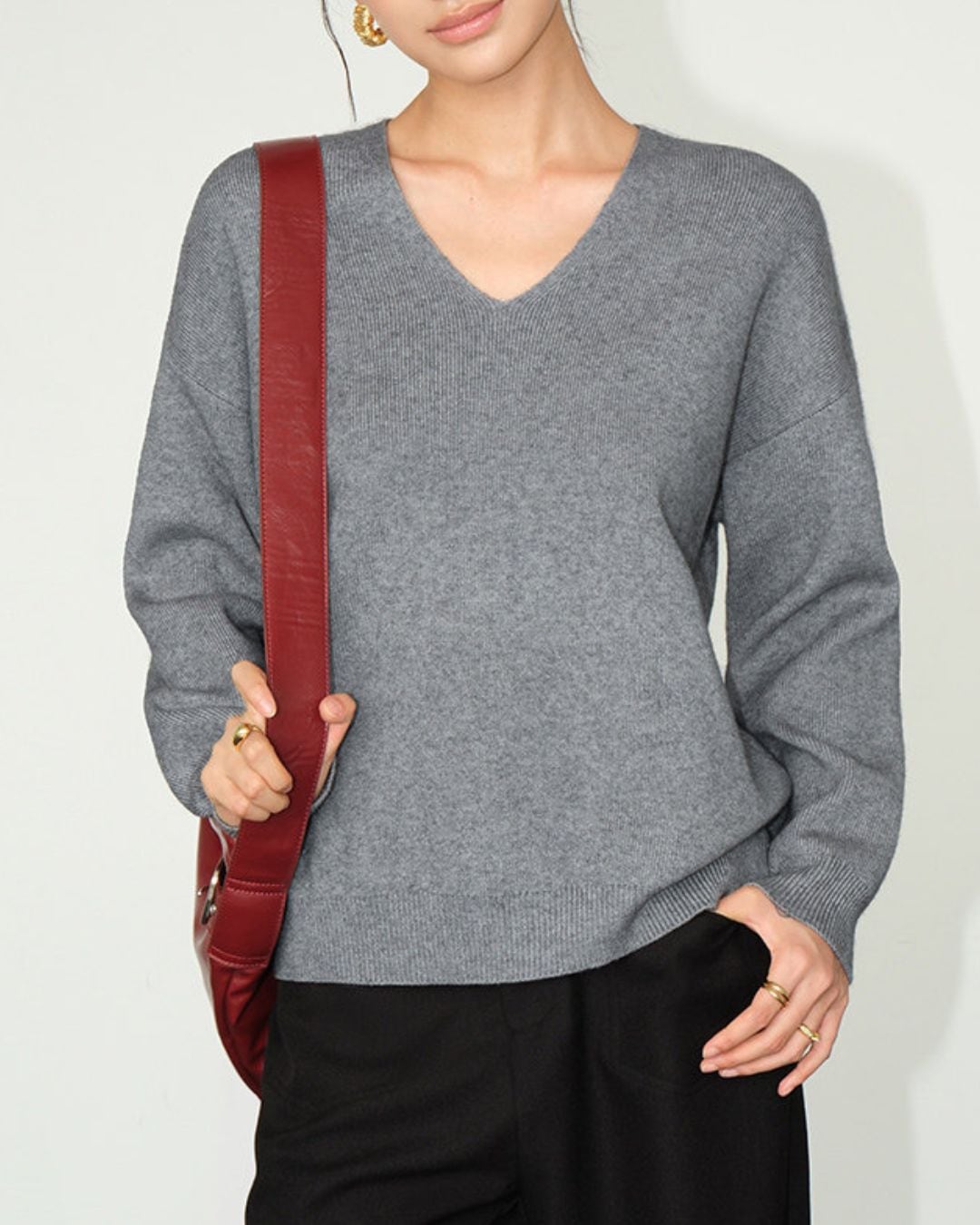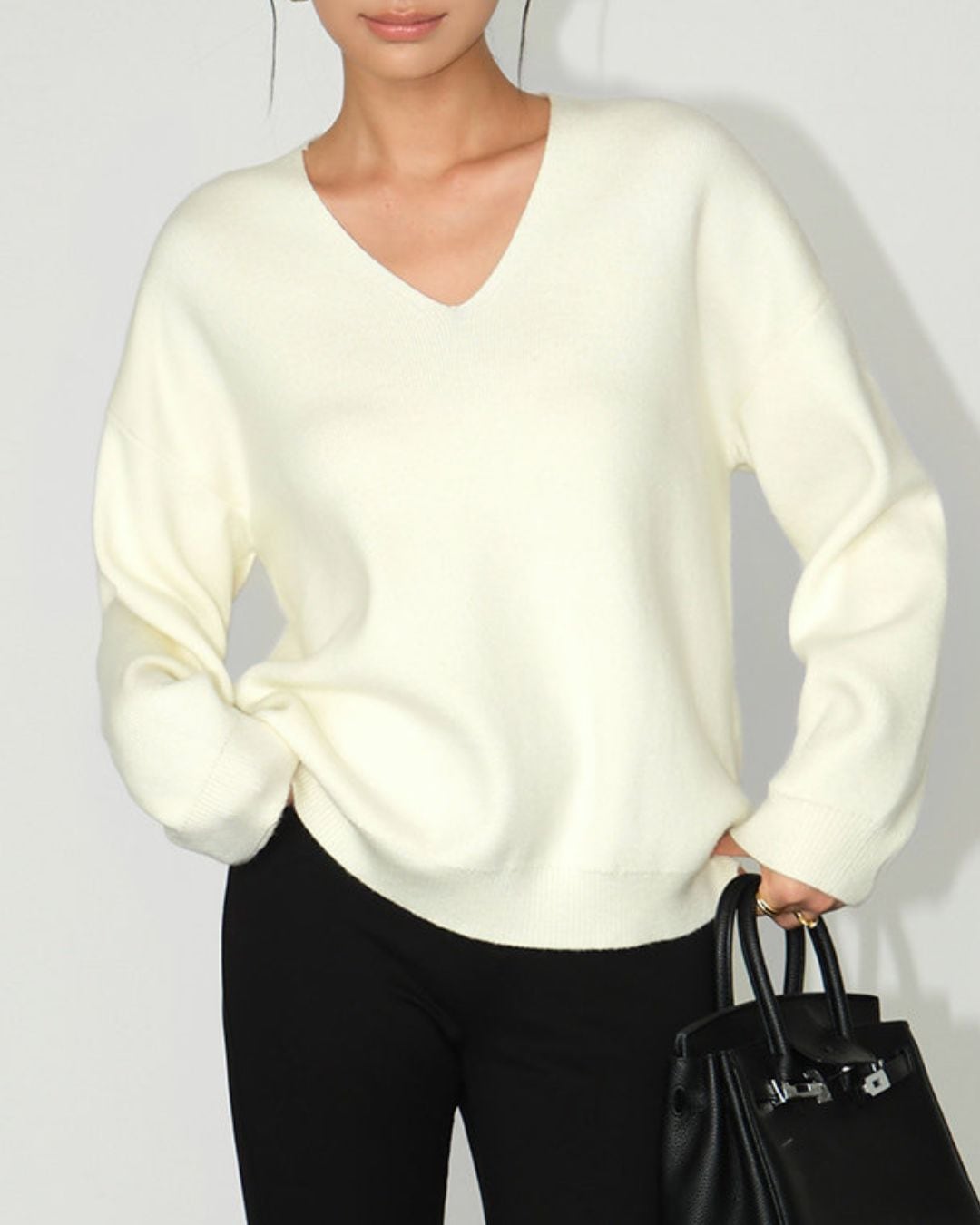 Vネックが女性らしさを引き立てる長袖ニット。