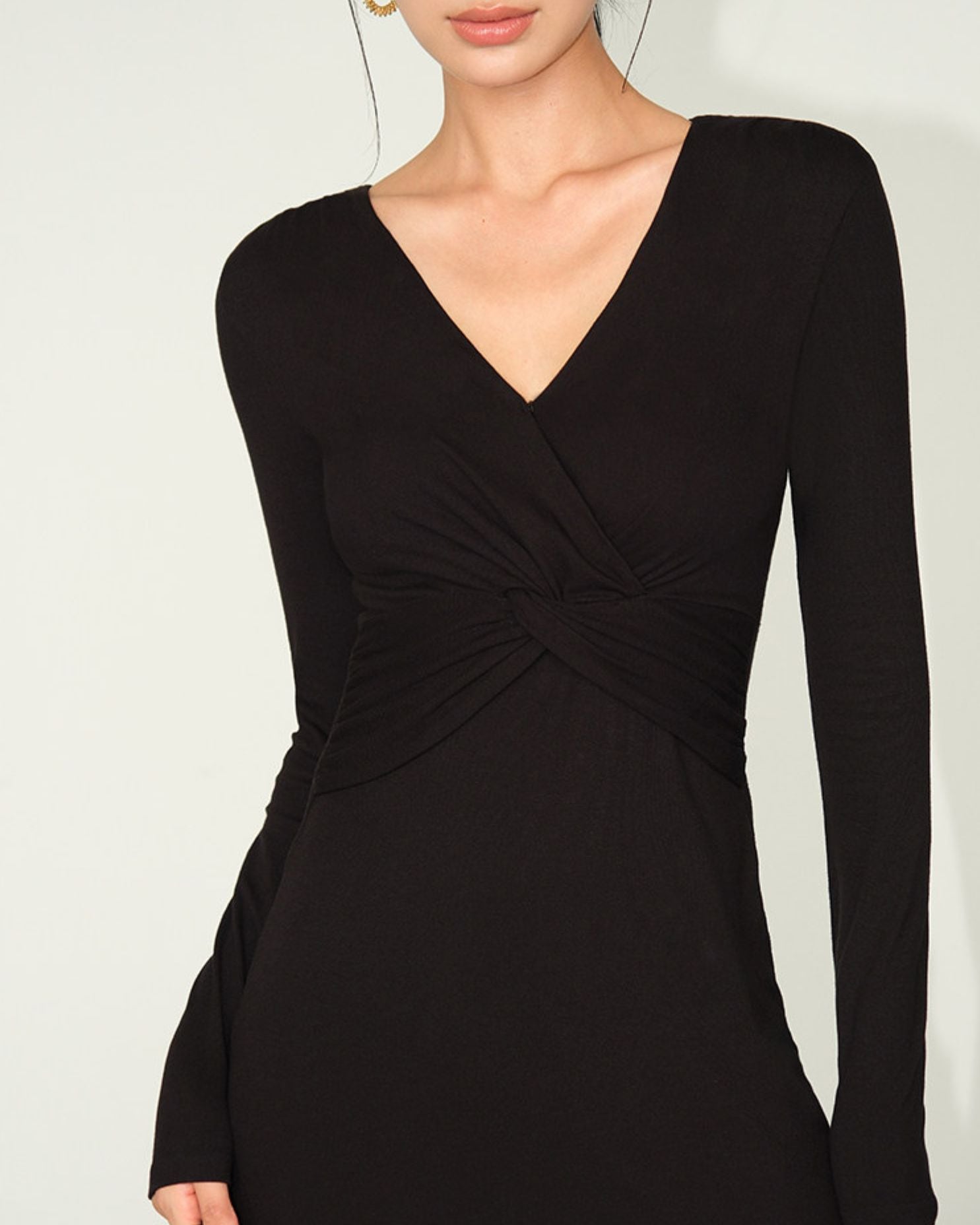 Vネックがデコルテを美しく見せてくれるミモレ丈ワンピースです。長袖なので、一枚で着ても上品な印象に。ちょっとしたお出かけや、アクセサリーをプラスしてパーティーシーンにも活躍します。