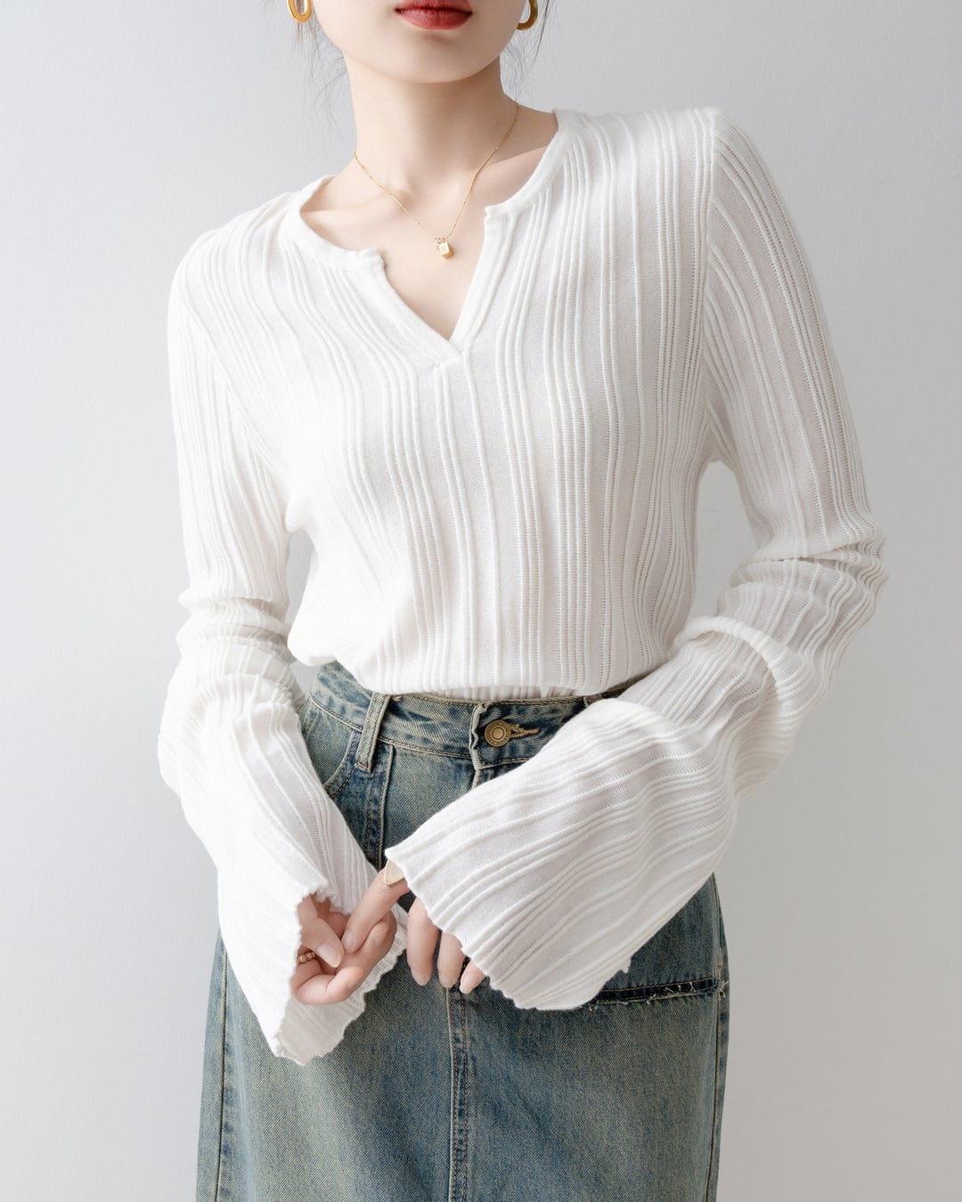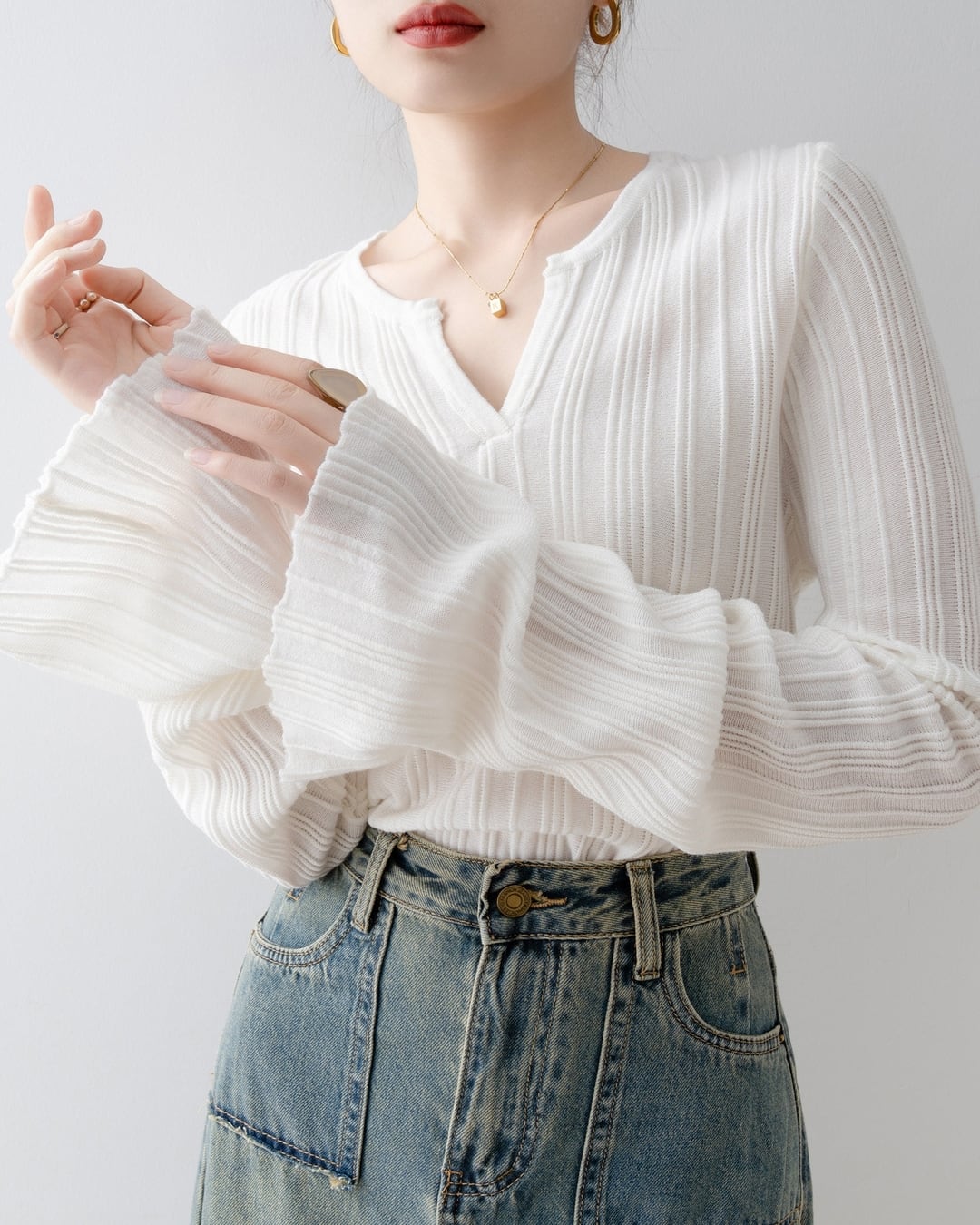 ベルスリーブが女性らしさを演出し、シンプルな中にもフェミニンな印象をプラスします。