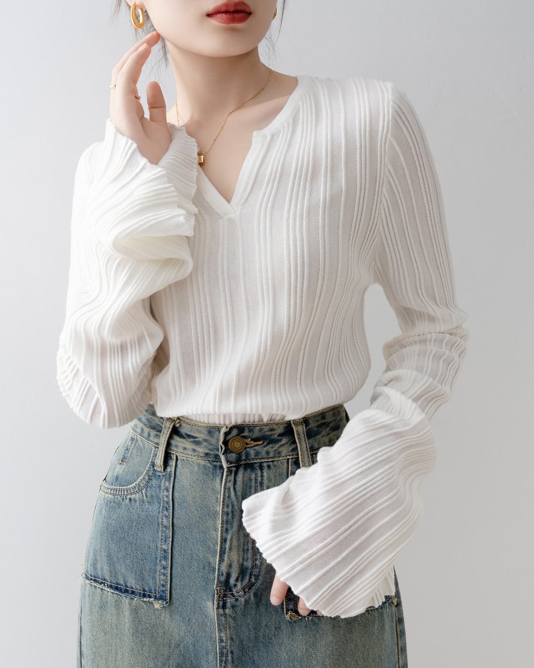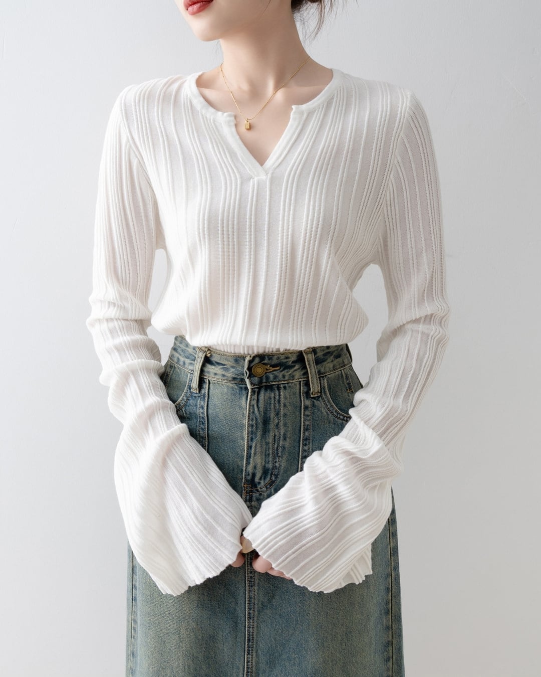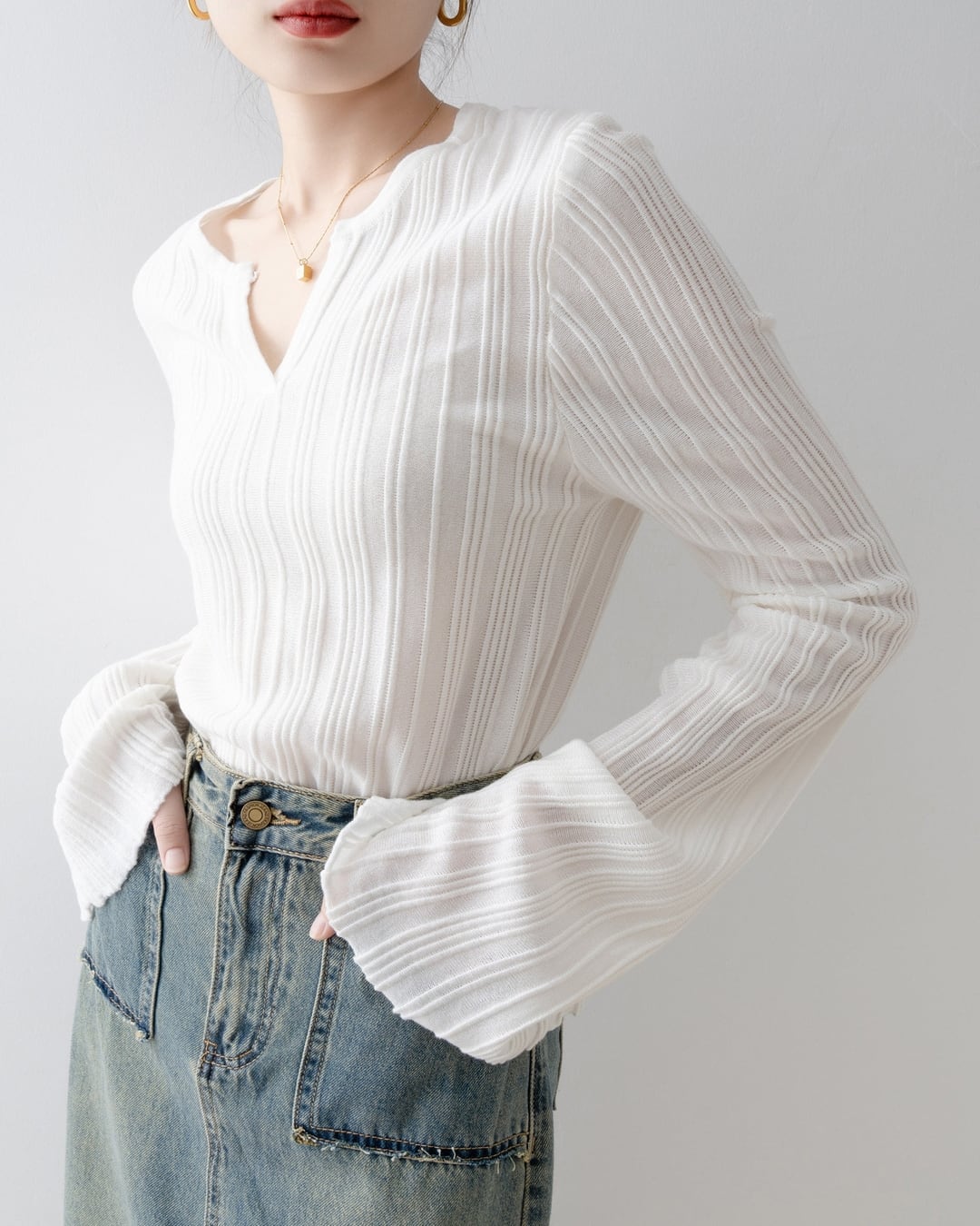 キーネックがデコルテを美しく見せてくれるリブニット。