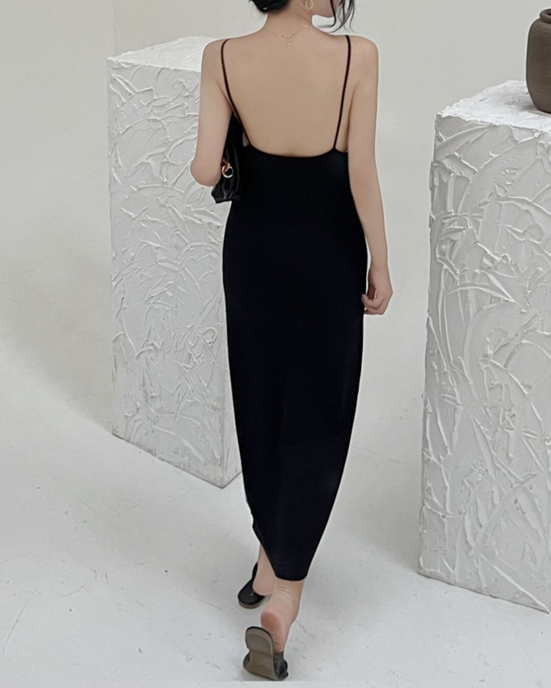 スリムなシルエットがボディラインを美しく見せ、深めのバックオープンデザインが抜け感と色気をプラス。