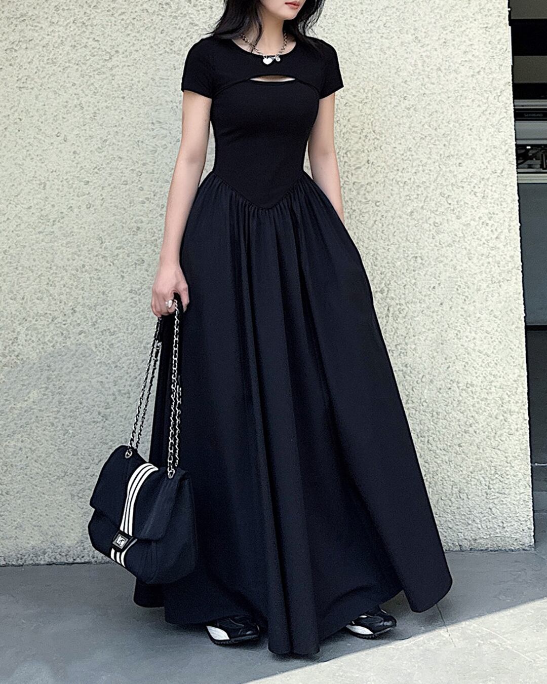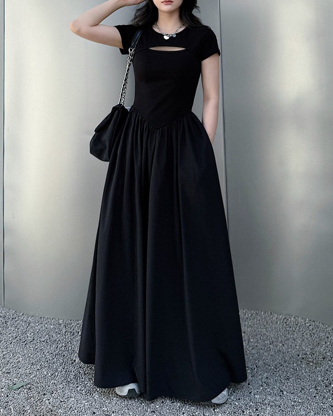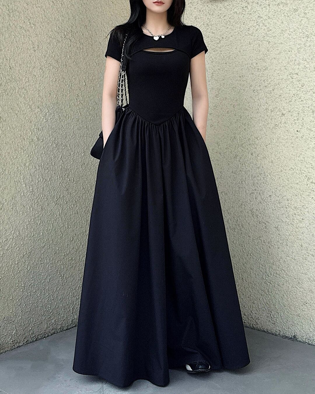 デコルテのカットアウトデザインが女性らしい半袖ロングワンピースです。